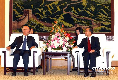 9月27日,在天津出席2008夏季達(dá)沃斯論壇的中國(guó)總理溫家寶,會(huì)見(jiàn)世界經(jīng)濟(jì)論壇主席施瓦布。中新社發(fā) 張宇 攝