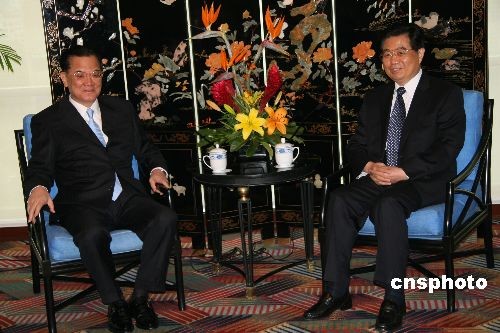 胡錦濤與夫人劉永清,當(dāng)?shù)貢r(shí)間二十一日上午在秘魯首都利馬同連戰(zhàn)和夫人連方瑀會(huì)面,這是胡錦濤與連戰(zhàn)的第六次會(huì)面,也是今年以來兩人第三次會(huì)面。中新社發(fā) 齊彬 攝
