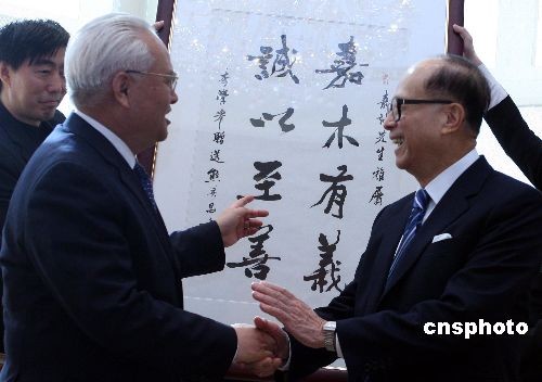 12月4日,中國民政部部長李學舉在北京會見香港長江實業(集團)有限公司主席李嘉誠先生,就民政部與李嘉誠基金會在全國范圍內合作實施大型公益項目“重生行動——全國貧困家庭唇腭裂兒童手術康復計劃”進行交談。據悉,李嘉誠基金會先期捐資5000萬元人民幣,民政部投入福利彩票公益金5000萬元,共計1億元,為全國貧困家庭中患有唇腭裂及相關畸形的兒童免費提供手術與康復治療,幫助他們解除疾患,健康成長。中新社發 宋吉河 攝