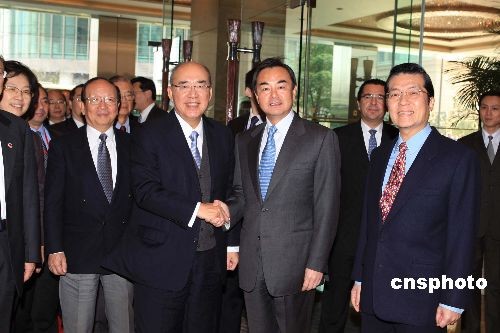 12月19日中午,中國國民黨主席吳伯雄一行乘直航包機抵達上海,準備出席將于二十日至二十一日在上海舉行的第四屆兩岸經(jīng)貿(mào)文化論壇。中共中央臺辦主任王毅在香格里拉酒店迎候吳伯雄一行。中新社發(fā) 潘索菲 攝
