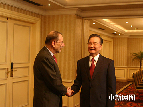 正在這里對歐盟總部進行正式訪問的中國總理溫家寶,當地時間一月三十日上午在下榻飯店會見了歐盟理事會秘書長兼共同外交與安全政策高級代表索拉納(左)。雙方對中歐關系重要性均給予高度肯定。