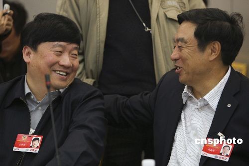 3月4日,全國政協十一屆二次會議進行分組討論,審議政協全國委員會常務委員會工作報告和提案工作情況報告。圖為招商銀行行長馬蔚華與浦發銀行董事長吉曉輝交談。中新社發 盛佳鵬 攝