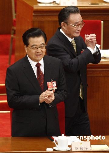 3月9日,十一屆全國人大二次會議在北京人民大會堂舉行第二次全體會議,圖為國家主席胡錦濤、全國人大常委會委員長吳邦國在主席臺就座。中新社發 盛佳鵬 攝
