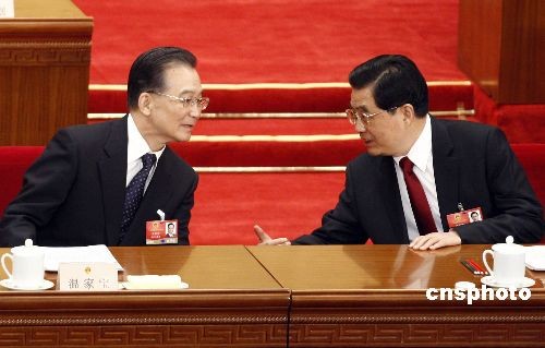 3月10日,十一屆全國(guó)人大二次會(huì)議舉行第三次全體會(huì)議,最高人民法院院長(zhǎng)王勝俊、最高人民檢察院檢察長(zhǎng)曹建明分別作工作報(bào)告。圖為國(guó)家主席胡錦濤與國(guó)務(wù)院總理溫家寶在會(huì)議開(kāi)始前交談。中新社發(fā) 盛佳鵬 攝