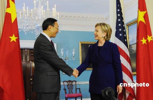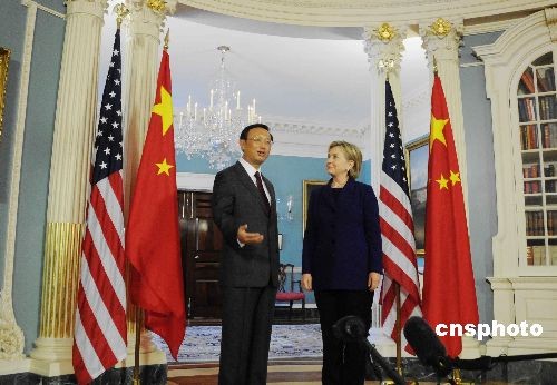 正在美國訪問的中國外交部長楊潔篪當?shù)貢r間三月十一日在華盛頓會見了美國國務(wù)卿希拉里。希拉里表示,此前她對中國的訪問富有成果,她對中國外長這么快進行回訪表示高興。中新社發(fā) 邱江波 攝