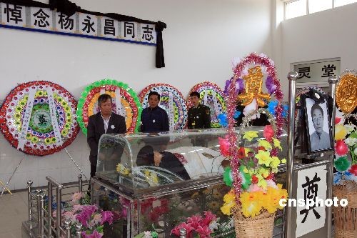 4月22日,“雪龍號”極地科考船失事直升機失蹤機組人員楊永昌追悼會在上海長興島殯儀館舉行,與楊永昌生前一同到極地從事科考的隊友專程為楊永昌送行。4月12日,“雪龍號”極地科考船租用的艦載直升機在完成科考任務后返回駐地時失事墜海。4名機組人員隨機落水,其中3人獲救。4月20日,經過近8天的搜尋,失蹤機組人員楊永昌的遺體在長江口水域振華港機0號碼頭附近被發現并打撈上岸。中新社發 潘索菲 攝
