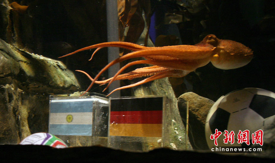 據(jù)悉,海洋館員把分別印有德、阿旗幟的貝殼放入玻璃缸,與對(duì)英格蘭隊(duì)比賽前脆快取出德國(guó)那枚貝殼不同,章魚“保羅”對(duì)德國(guó)和阿根廷的對(duì)決有些“猶豫不決”,“考慮了長(zhǎng)達(dá)一小時(shí)”但是最終還是取出了印有德國(guó)旗幟的貝殼。