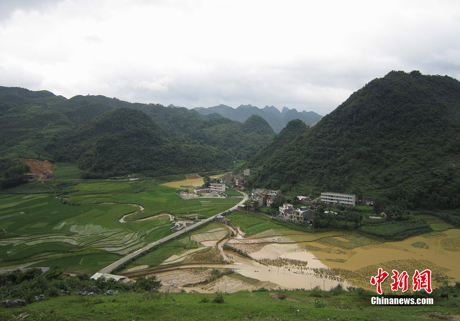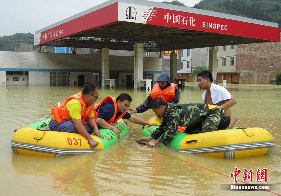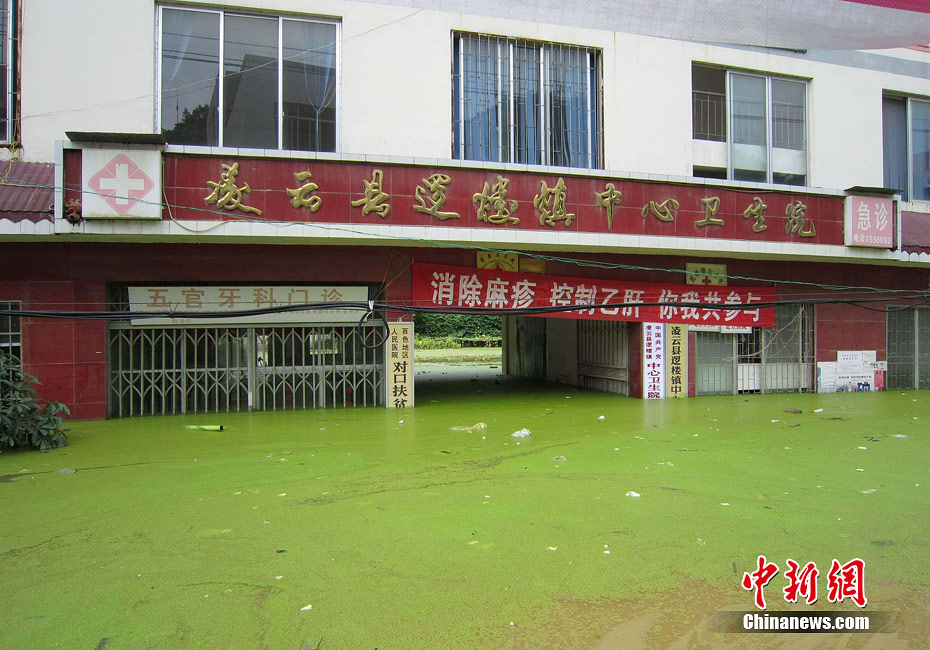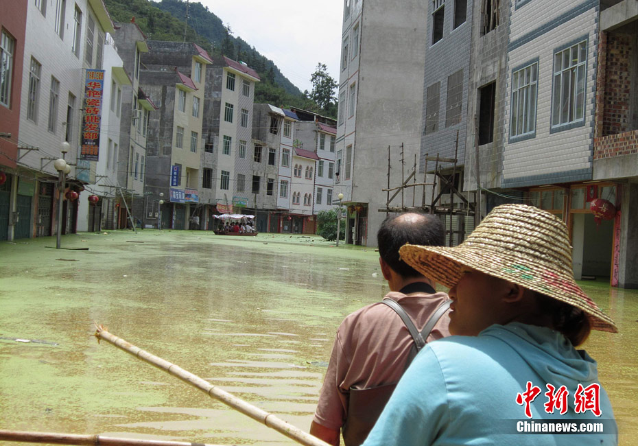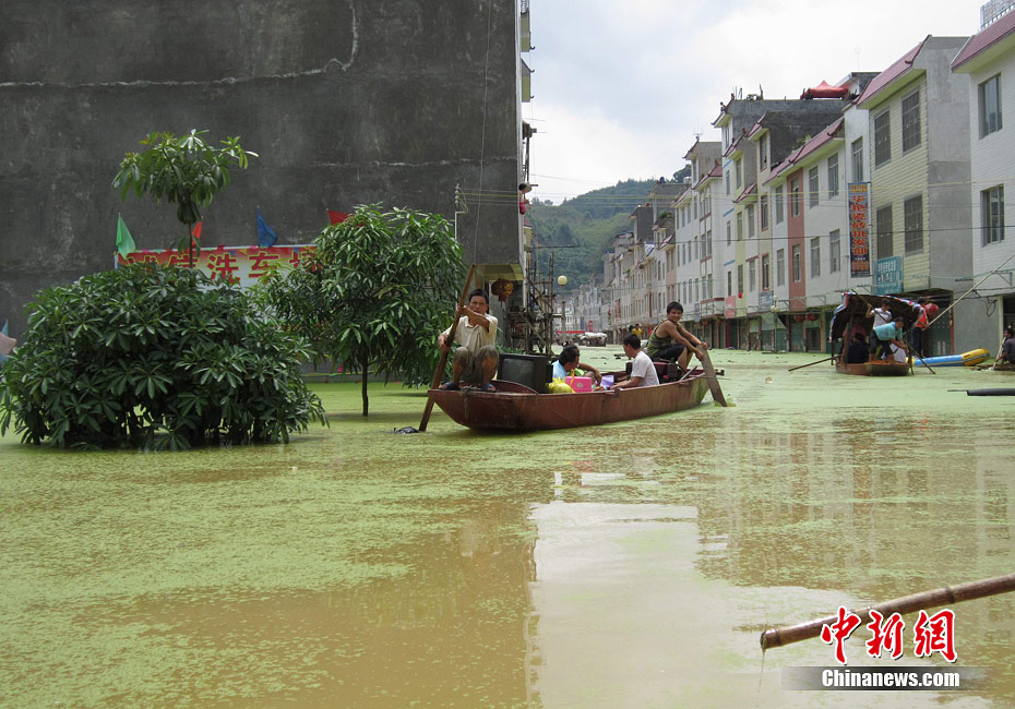 由于遭遇連日暴雨,廣西凌云縣邏樓鎮(zhèn)內(nèi)澇成災(zāi),全鎮(zhèn)一片汪洋,積水深達2米多高,民眾只能用小機船和自制排伐作為交通工具。由于該鎮(zhèn)所在地為一個小盤地,沒有排水的地方,估計一個月后積水才能自然排完。6月27日20時至29日,廣西凌云縣遭遇罕見強降雨襲擊,造成嚴重洪澇災(zāi)害。初步統(tǒng)計,當(dāng)?shù)匾丫o急轉(zhuǎn)移一萬多人。圖為30日所攝邏樓鎮(zhèn)被淹景象。黃燕飛 攝