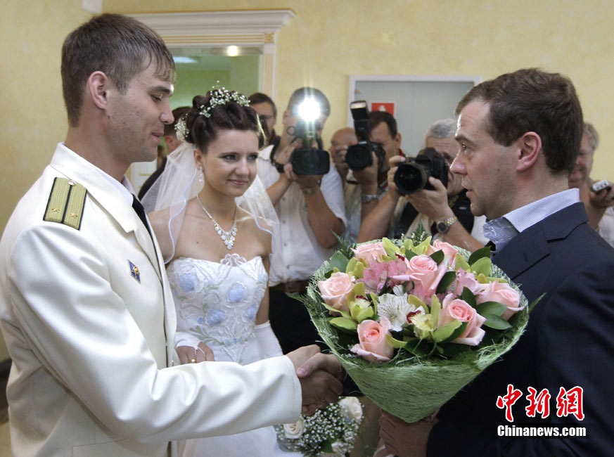 7月1日,俄總統梅德韋杰夫在遠東視察時,參觀了當地一處婚姻登記處,成為三對新人的婚禮見證人,并給他們送上了非常貴重的禮物。