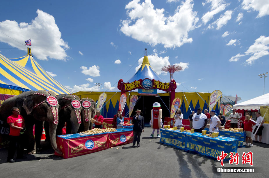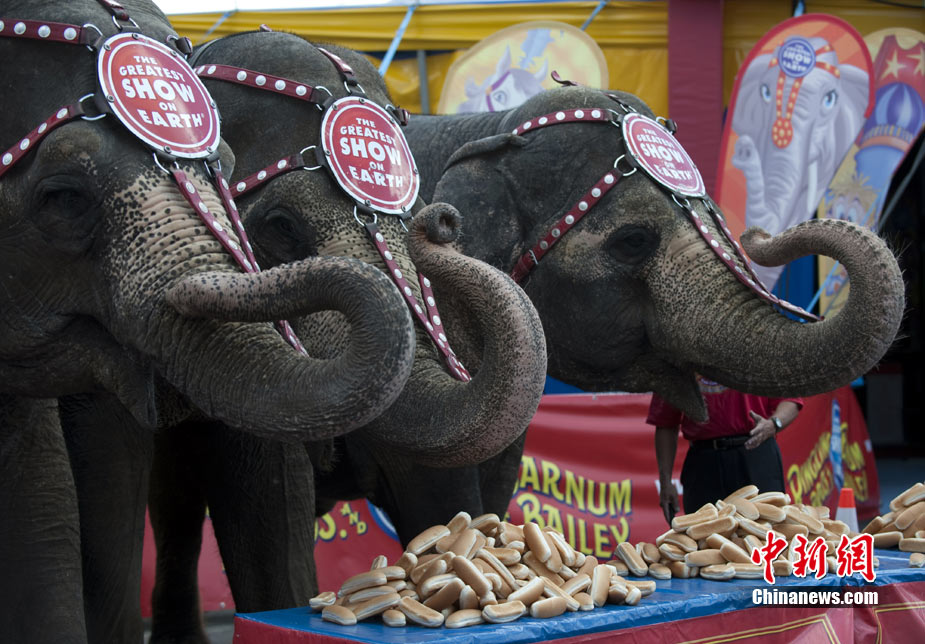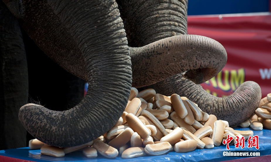 當地時間7月2日,在美國紐約的科尼島,一支由三只大象組成的“隊伍”和三位大胃王進行了一次吃面包PK。最終大象隊獲得了勝利。