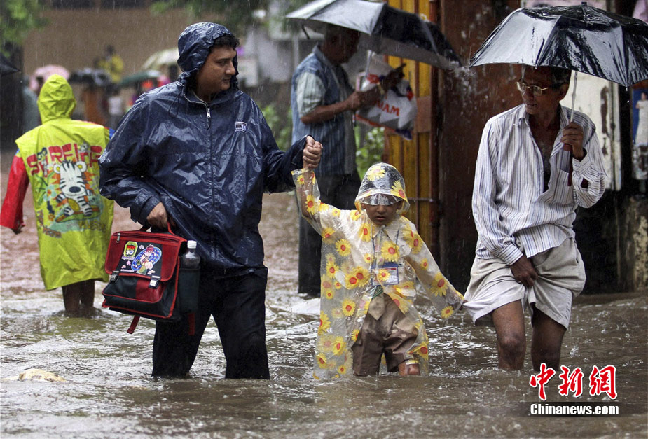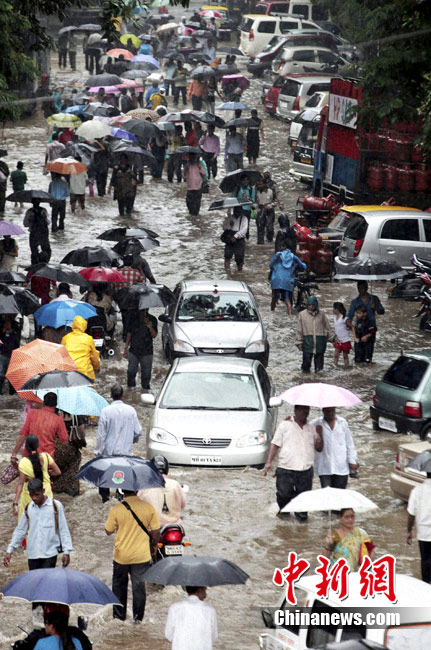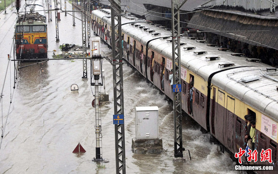 7月3日,印度孟買遭暴雨襲擊。市區幾乎變成澤國,公路、鐵路等交通受影響嚴重。