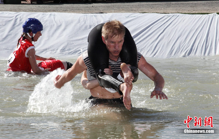 7月3日,一年的一度的世界背老婆大賽在芬蘭中部小鎮松卡耶爾維舉行,參賽者背著自己的老婆在泳池里行走,最終來自芬蘭的一對選手最先通過終點。