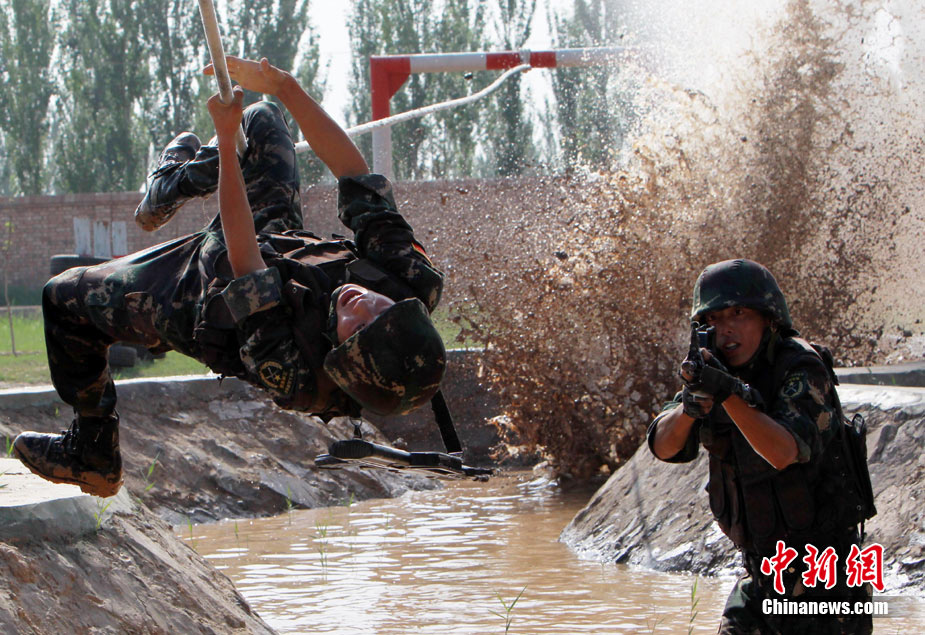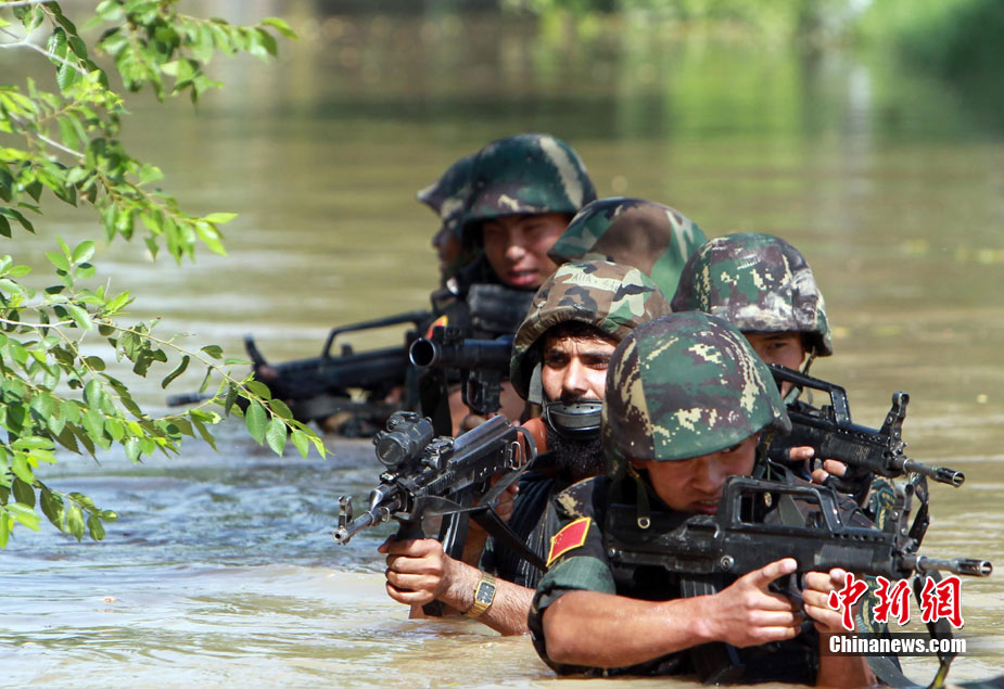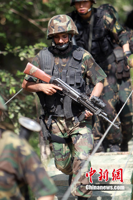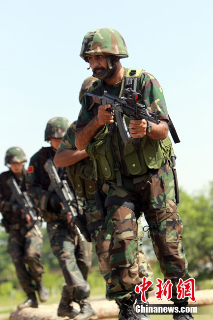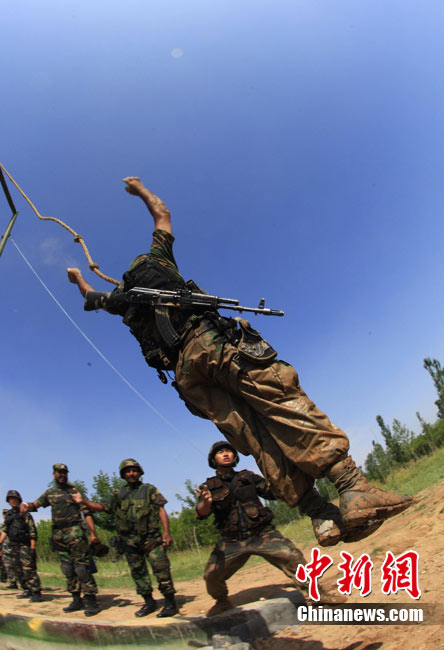 7月5日,中巴兩軍特戰士兵展開高強度魔鬼訓練。此次代號為“友誼—2010”的中國巴基斯坦反恐聯合訓練在中國寧夏青銅峽地區展開,訓練主要以邊境地區山地聯合反恐作戰為課題,分為展示交流、混編同訓、綜合演練三個階段。 中新社發 杜洋 攝
