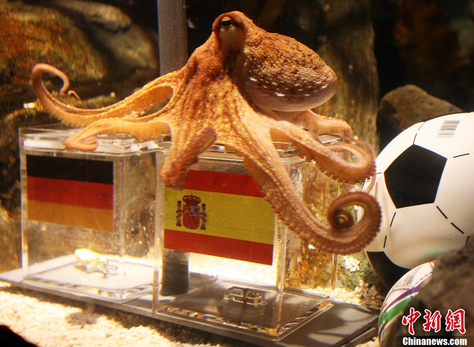 7月6日下午,德國某水族館的章魚保羅再次出動,對世界杯半決賽德國與西班牙進行了預測,最終他選擇了西班牙。保羅認為歐洲冠軍西班牙將在半決賽擊敗勢頭強勁的德國隊進入決賽。《圖片報》網站的直播員在公布結果的同時說道:“希望勒夫的小伙子們能扭轉局勢,拯救這場半決賽。”或許,對于德國球迷來說還有一個自我安慰的理由:保羅在2008年歐錦賽上預測的準確率是80%,并且唯一錯的就是決賽與西班牙之戰。他們或許已經開始期待:兩年后的世界杯預測不要百發百中,至少在半決賽時錯一次。