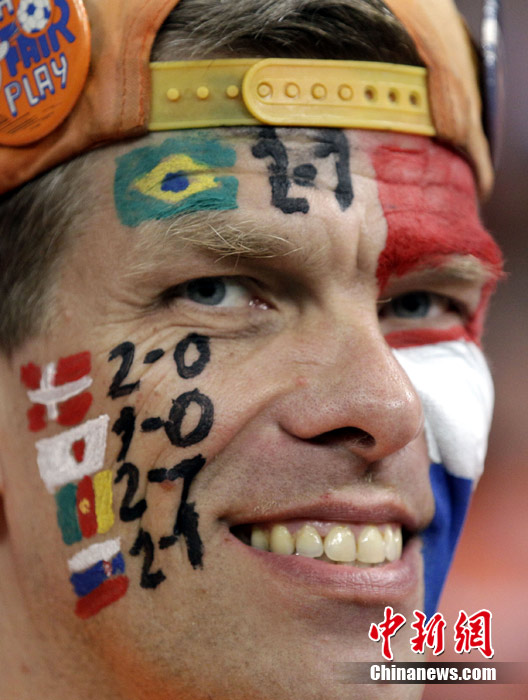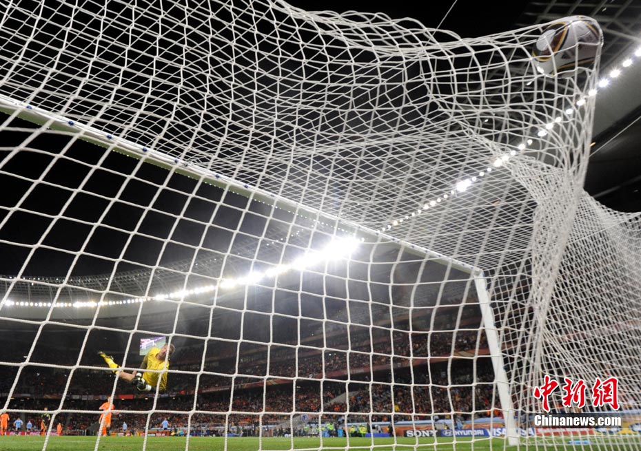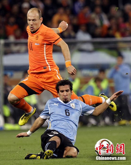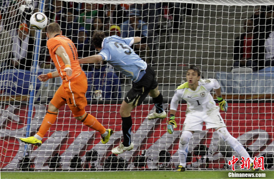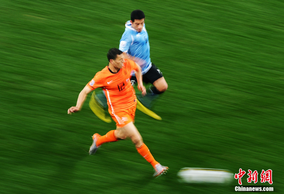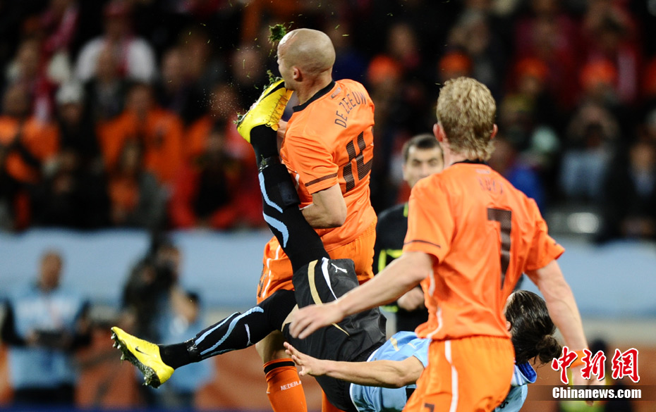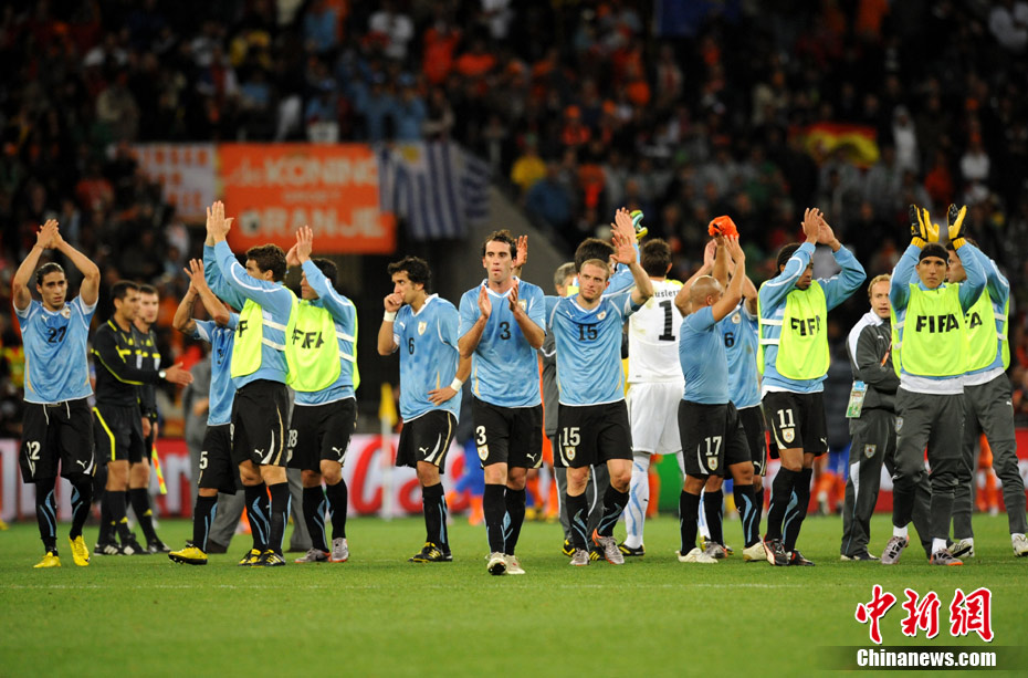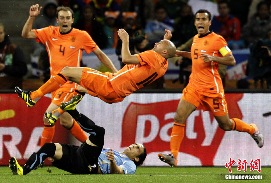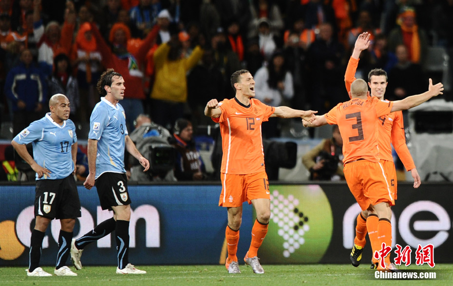 7月7日凌晨2:30,南非世界杯半決賽首場較量在開普敦綠點球場拉開戰(zhàn)幕,由南美老牌勁旅烏拉圭迎戰(zhàn)荷蘭隊。布隆克霍斯特遠(yuǎn)射先拔頭籌,而弗蘭也通過一記遠(yuǎn)射將比分扳平。下半場斯內(nèi)德和羅本連續(xù)進(jìn)球一度令荷蘭隊鎖定勝局,然而補時階段烏拉圭人的進(jìn)球似乎又燃起了最后的希望,但荷蘭隊頂住了對手的瘋狂進(jìn)攻,3-2擊敗烏拉圭隊,成功挺進(jìn)決賽。