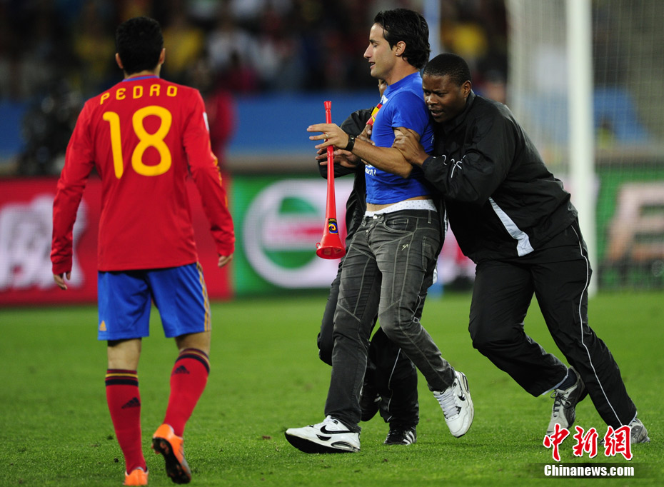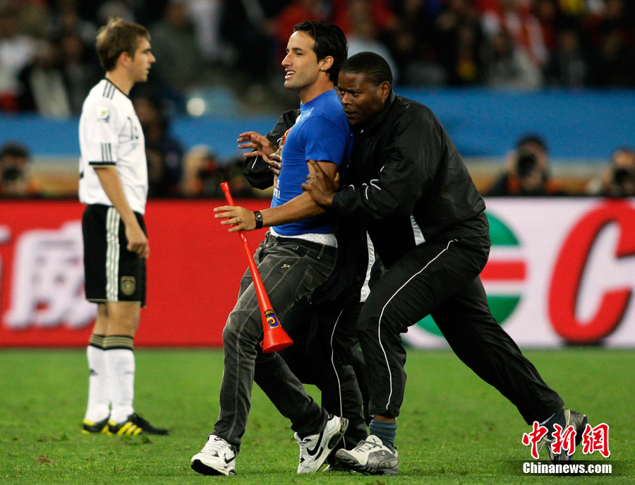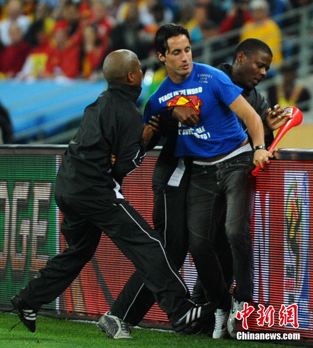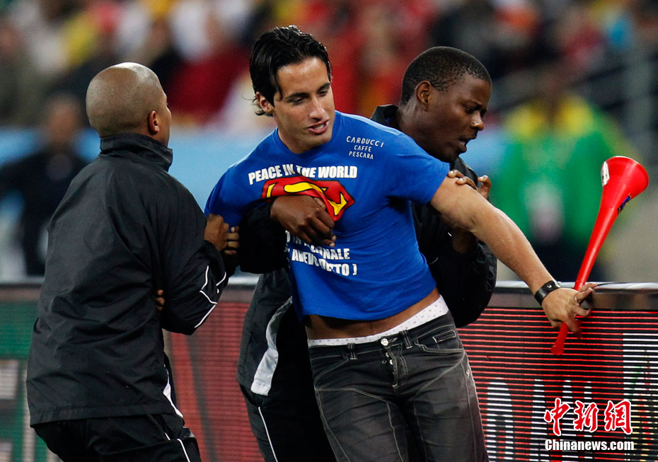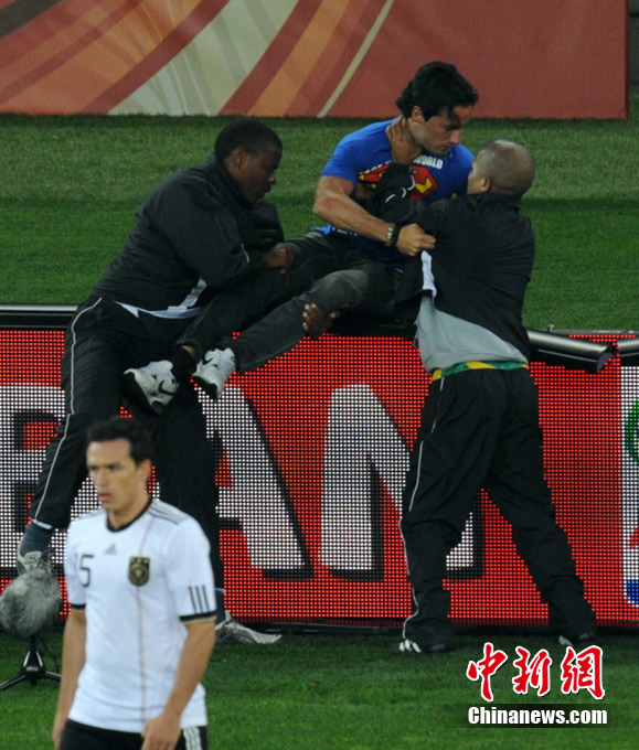 西班牙隊和德國隊激戰正酣時。一名球迷身穿超人背心突然闖進球場,此時雙方的比賽短暫地暫停了一會兒,球迷被保安推出了球場。后經有關部門證實,這是一名意大利球迷。