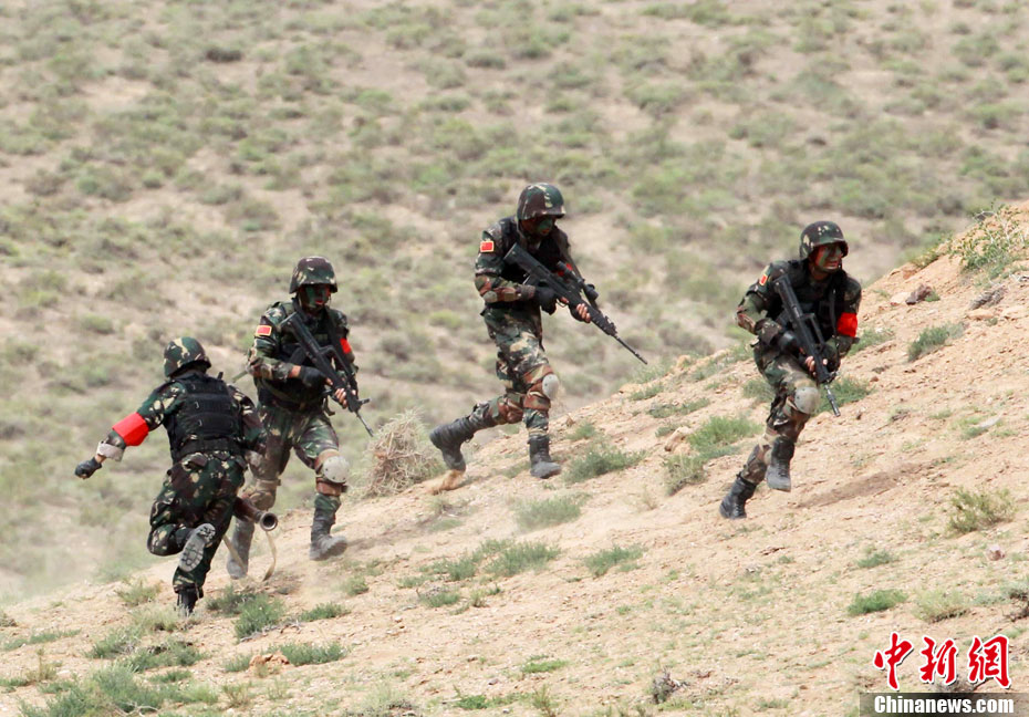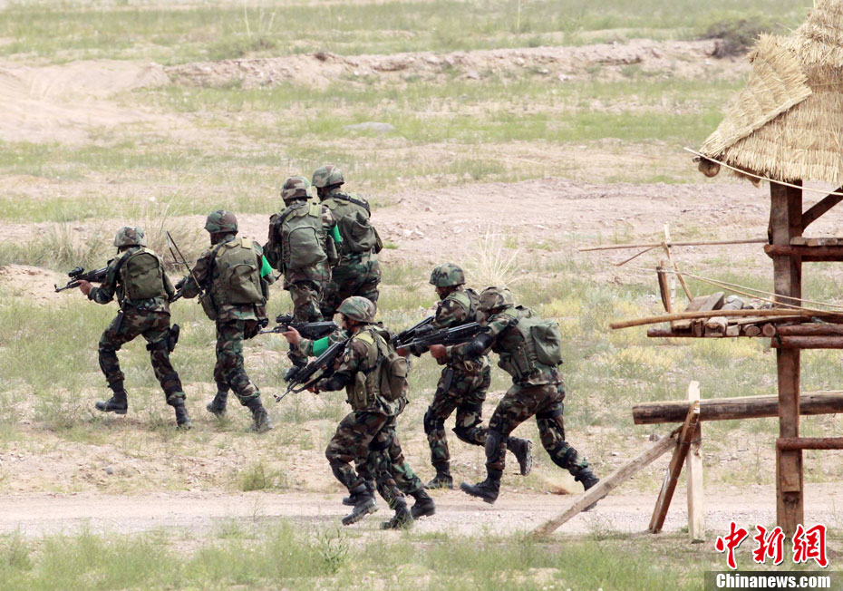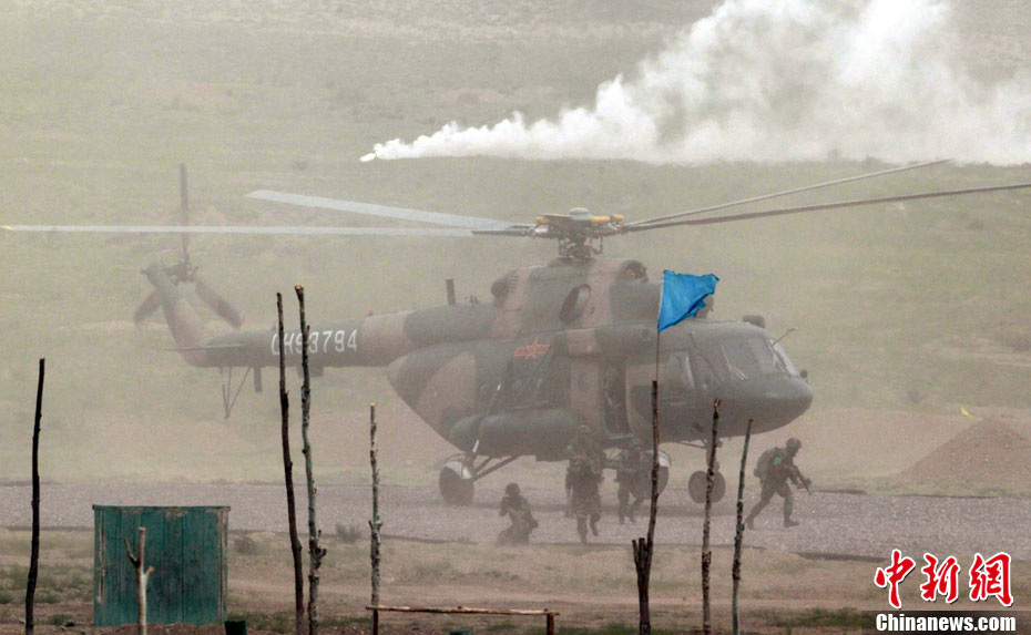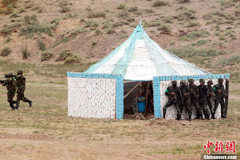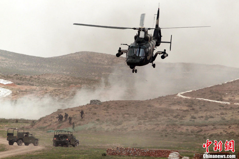 7月9日,友誼-2010”中巴反恐聯(lián)訓(xùn)在蘭州軍區(qū)某訓(xùn)練基地舉行實兵實彈演練,演練設(shè)計的背景是,對潛入中巴邊境地區(qū)實施襲擊破壞的國際恐怖分子進行聯(lián)合打擊。圍繞“邊境地區(qū)山地聯(lián)合反恐作戰(zhàn)”這一課題,演練了遠程投送、偵察監(jiān)視、立體封控、精確打擊、解救人質(zhì)、搜剿圍殲6個行動。這次反恐聯(lián)演的一個亮點,就是首次空地協(xié)同,聯(lián)合打擊,由地面反恐特戰(zhàn)人員引導(dǎo)殲轟機、武裝直升機實施空中火力突擊,采取精打要害的戰(zhàn)法,以建制內(nèi)的火器對恐怖分子營地重要目標實施火力打擊。中新社發(fā) 杜洋 攝