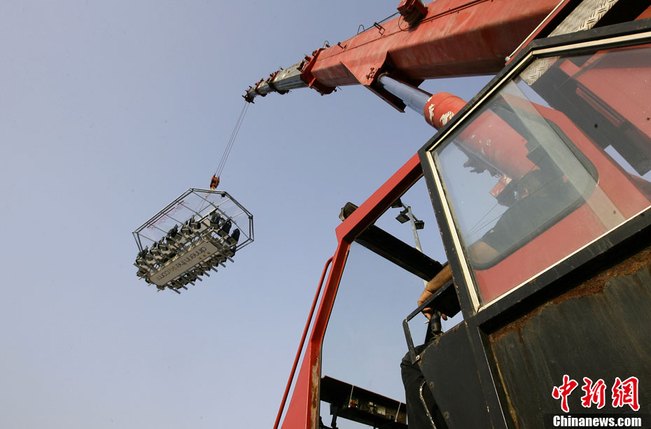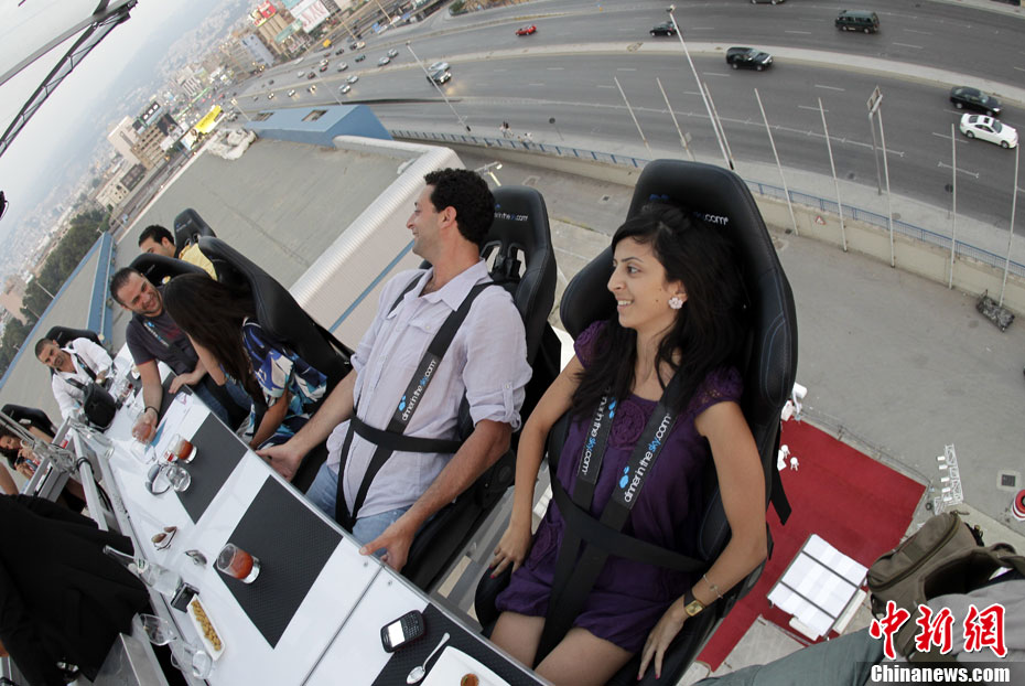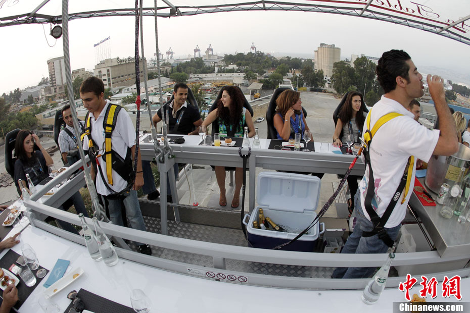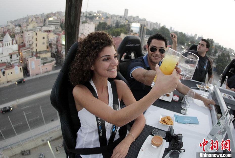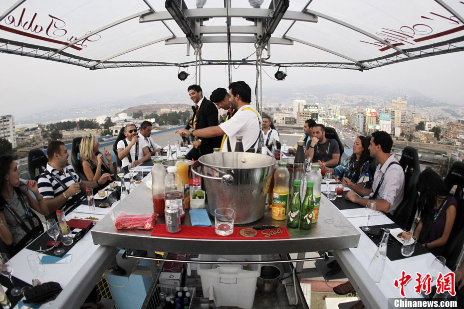 7月10日,黎巴嫩貝魯特22名賓客圍坐在被起重機吊起50米的餐桌旁享用“空中晚宴”。
