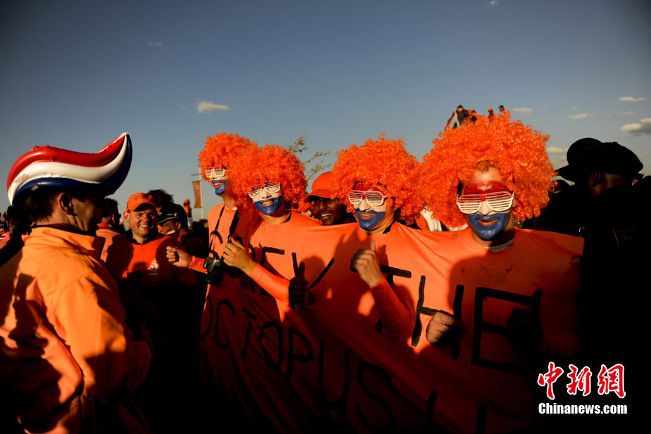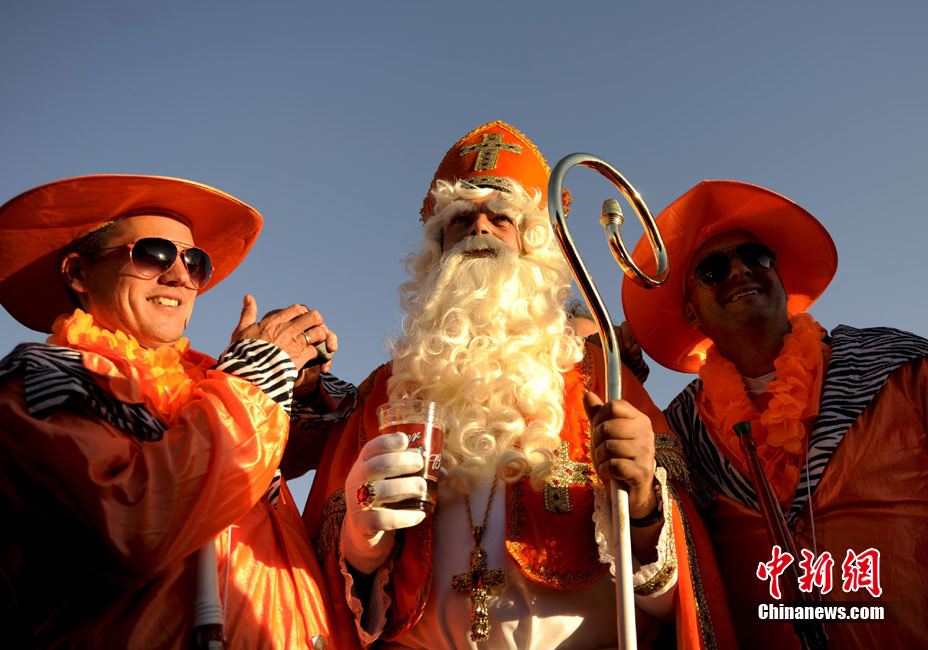7月11日,南非約翰內斯堡足球城,眾多荷蘭球迷在足球城球場外激情舞蹈。當晚,南非世界杯荷蘭對西班牙的決賽將在足球城球場舉行。中新社記者 廖攀 攝