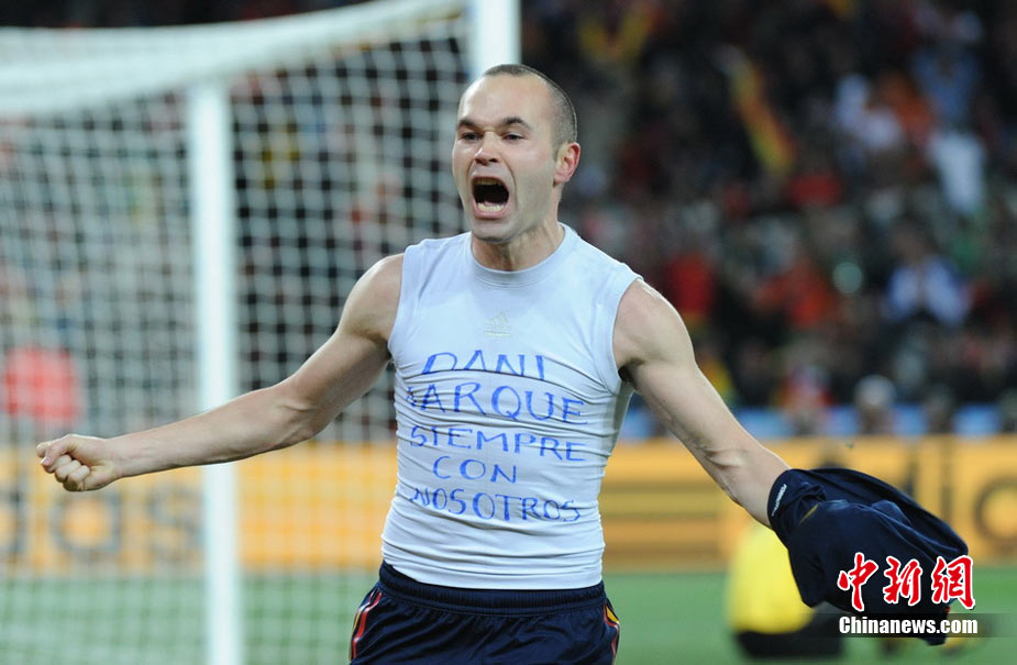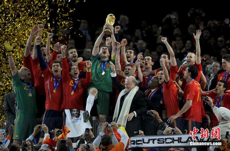 北京時間7月12日凌晨2:30,南非世界杯迎來了最終的決賽,在約翰內斯堡的足球城球場由荷蘭隊對陣西班牙。最終雙方經過120分鐘鏖戰,伊涅斯塔在第116分鐘攻入全場唯一一粒進球,絕殺十人應戰的荷蘭隊,史上首次奪得冠軍。
