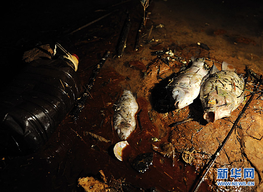 7月12日,位于汀江河下游的棉花灘庫區(qū)邊散落著因水質(zhì)污染致死的河魚。