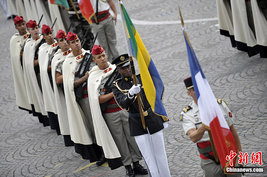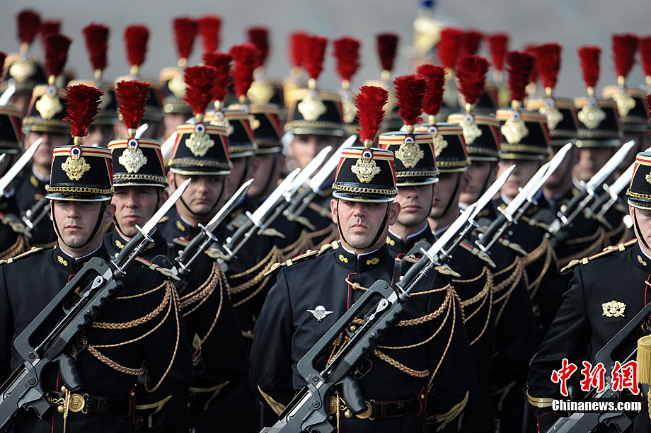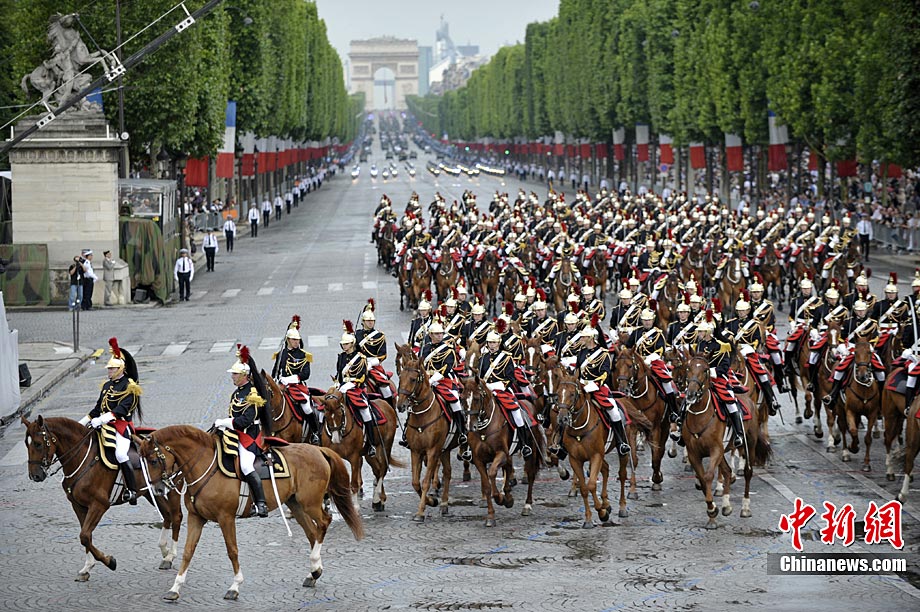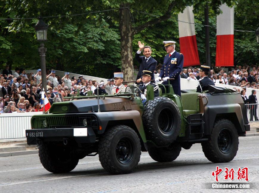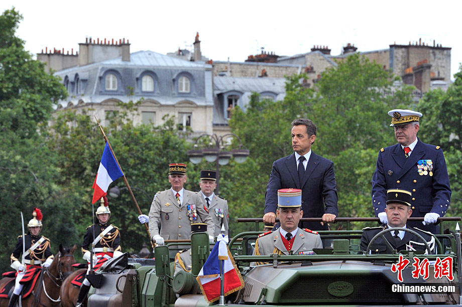 當地時間7月14日,法國巴黎舉行了盛大的國慶日閱兵式。圖為法國總統薩科齊在法國三軍總參謀長愛德華·紀堯的陪同下檢閱部隊。 中新社發 吳衛中 攝