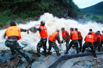 中新網都昌7月14日電(胡國林)14日,受強降雨襲擊,江西九江市都昌大港鎮梅溪水庫水位超過泄洪道1米左右,啟閉設備出現失靈,洪水如猛獸般狂瀉入下,部分村莊和數千畝農田被淹。 險情發生后,當地防汛部門立即組織抗洪搶險突擊隊,武警官兵和當地群眾冒著生命危險,拋石加固堤壩,防止洪庫潰堤,下游數千名村民已被安全轉移。