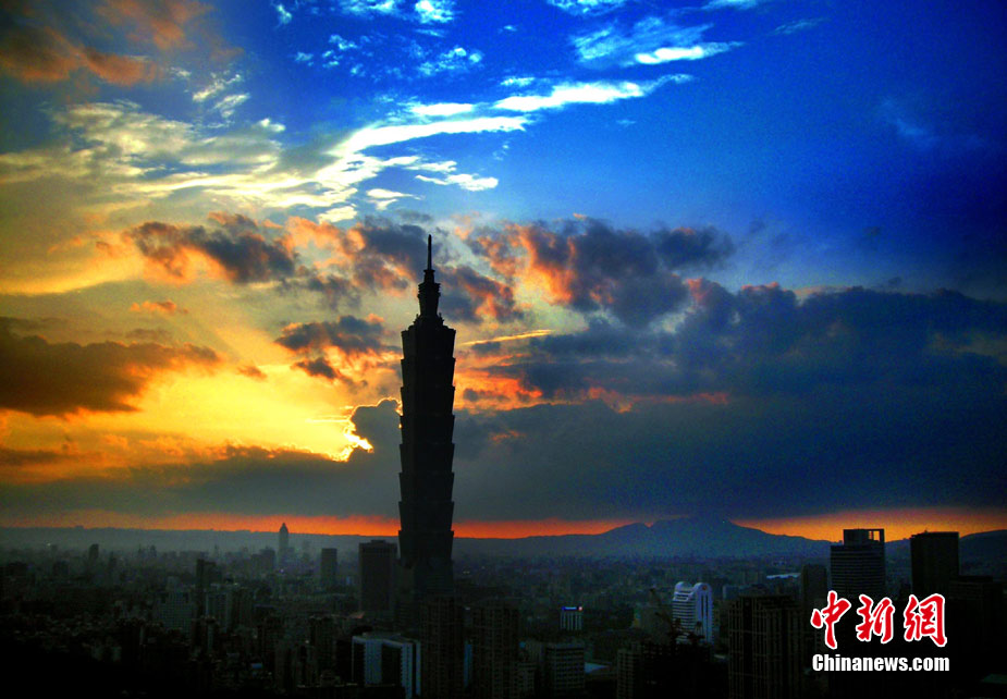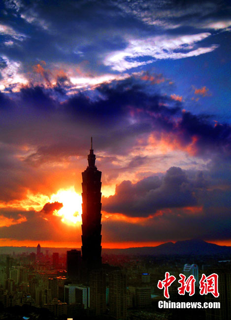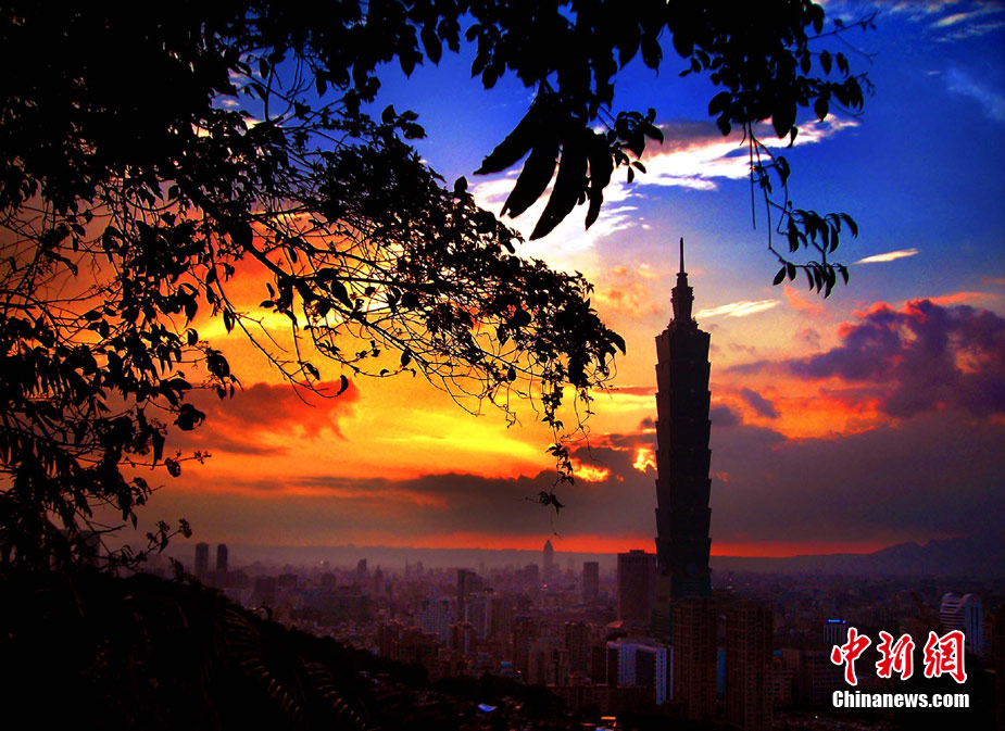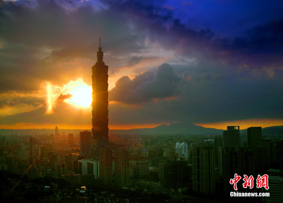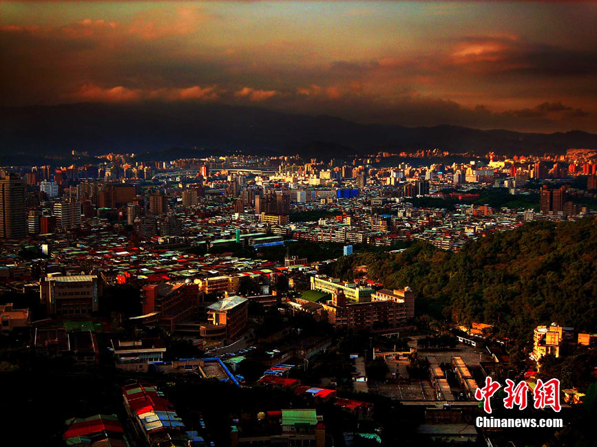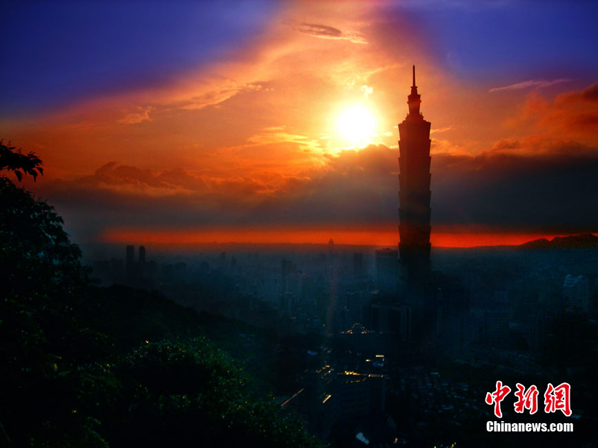 7月15日傍晚,臺北市一陣電閃雷鳴過后,太空霞光四射,從象山俯瞰市區,101摩天大樓聳入云霄,景觀如畫。美麗的臺北市地處盆地,氣候多變,夏季的城市景色也時常變幻莫測。中新社記者 宋吉河 攝