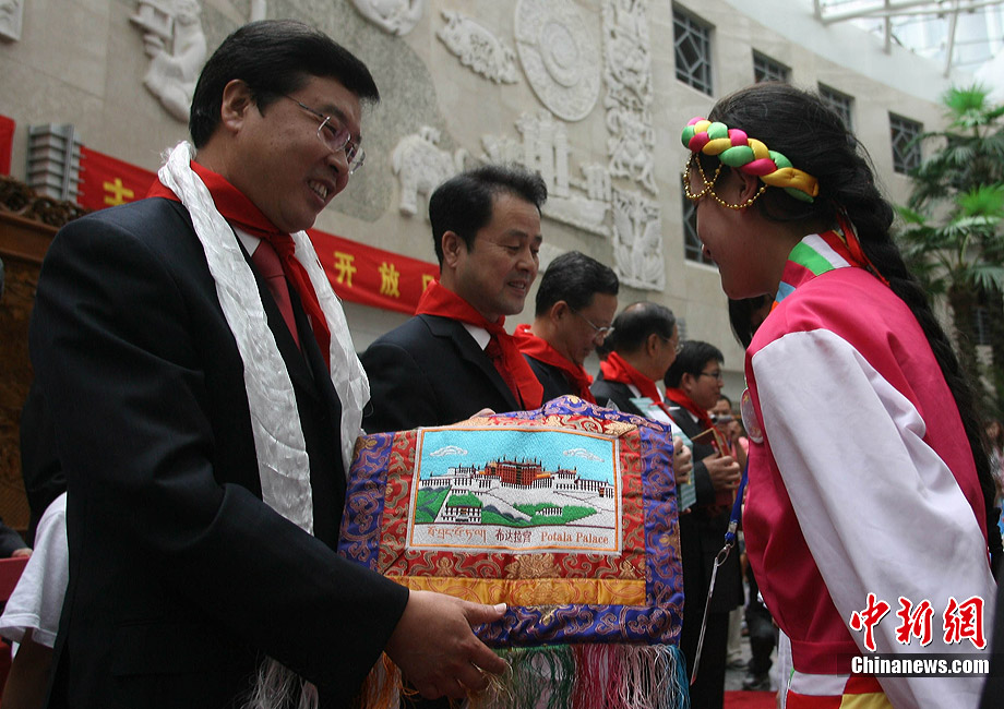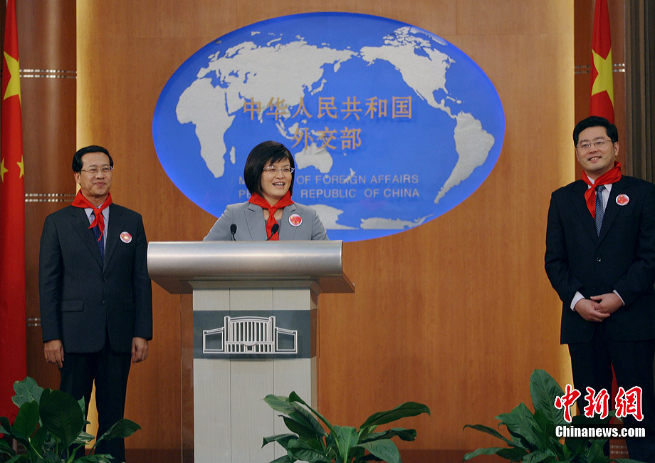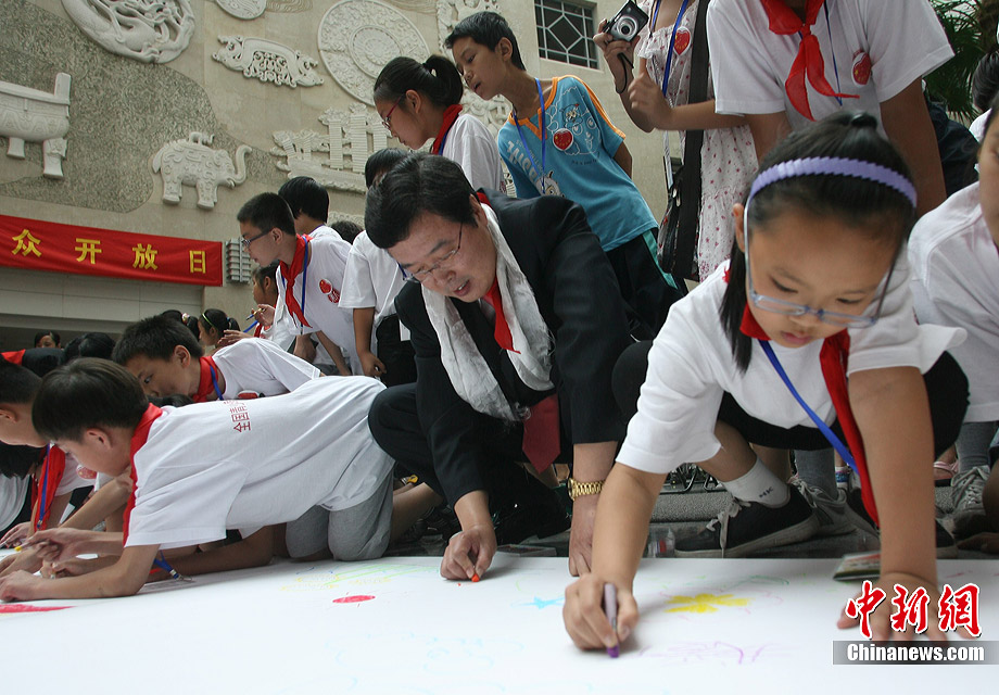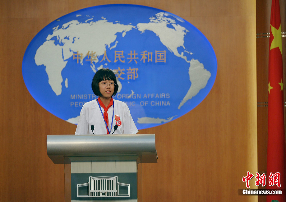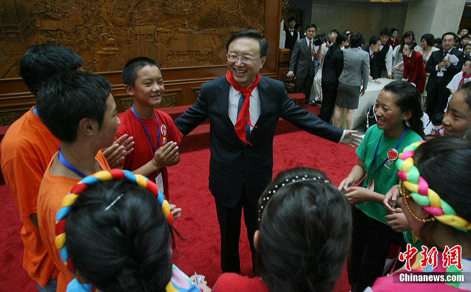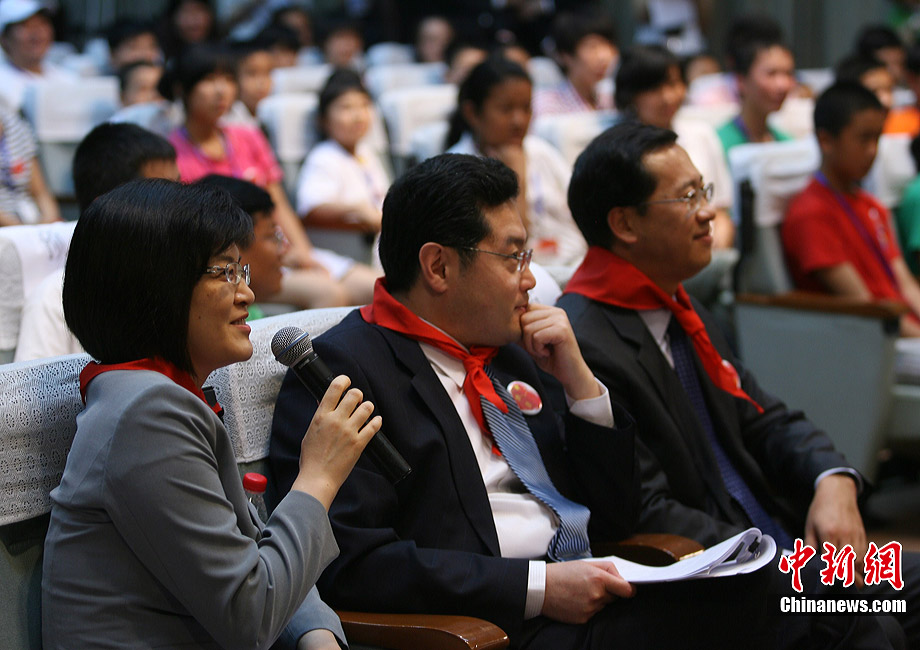 7月17日,在外交部橄欖廳,外交部長(zhǎng)楊潔篪勉勵(lì)玉樹(shù)震區(qū)小學(xué)生努力學(xué)習(xí)、重建家園。當(dāng)日,外交部舉辦第八次駐外使節(jié)任職宣誓儀式暨外交部“祖國(guó)在我心中”主題公眾開(kāi)放日。來(lái)自北京、玉樹(shù)、黑龍江、重慶等地的小學(xué)生參加了此次活動(dòng)。中新社發(fā) 蘇丹 攝