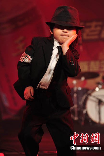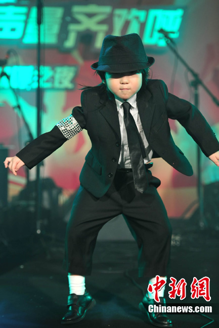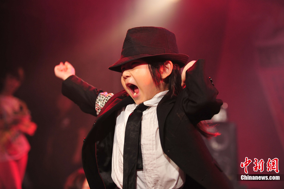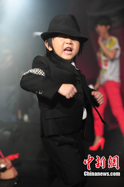 7月18日晚,陳楚生北京歌友會勁爆上演。4歲的街舞神童“小寶”王一鳴現場為陳楚生助陣。“小寶”年紀雖小,卻是位舞蹈天才,曾得到MJ舞蹈老師的肯定。他模仿MJ的經典舞步熱翻全場,贏得現場粉絲陣陣尖叫,風頭大有蓋過陳楚生之意。“小寶”驚人的舞蹈技藝也讓陳楚生大呼佩服。圖為小寶模仿起MJ像模像樣,舞技超群。中新社記者 李學仕 攝
