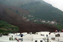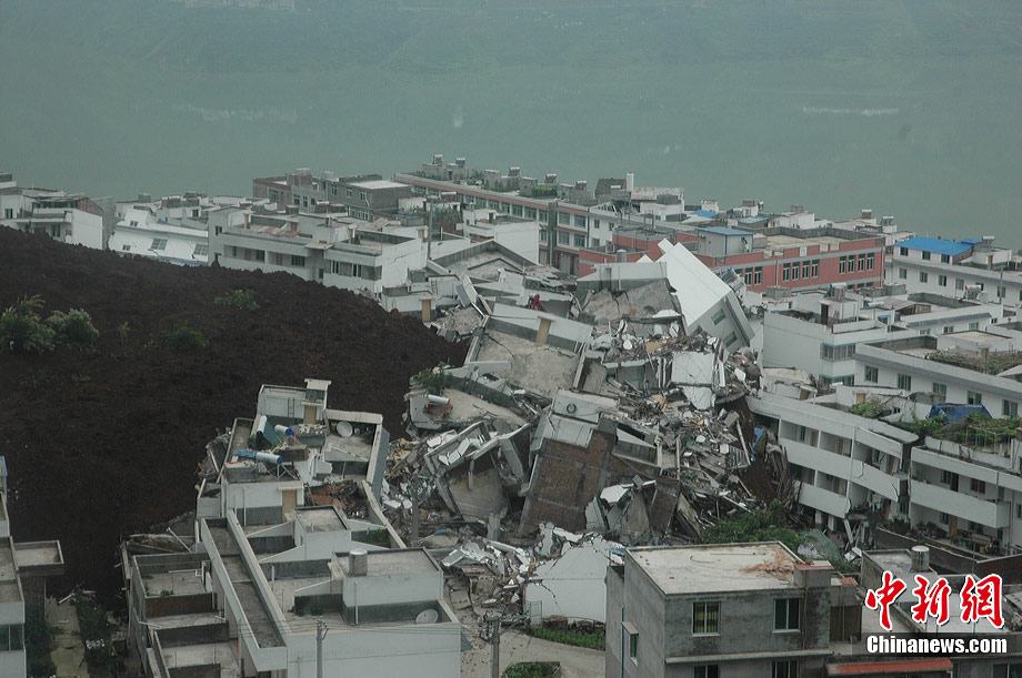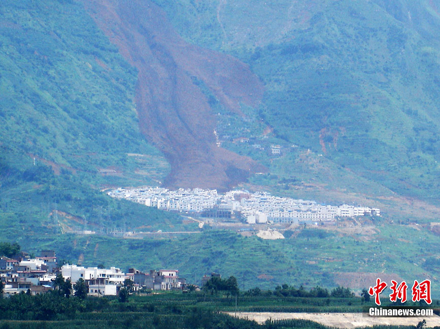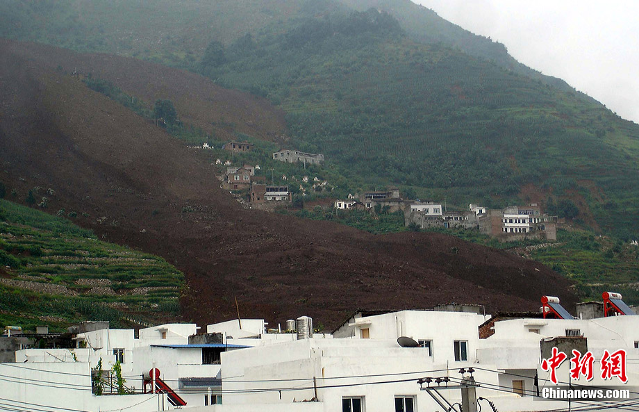 7月27日凌晨5時許,因連日來的持續強降雨和暴晴天氣,四川雅安市漢源縣萬工鄉雙合村一組萬工集鎮后背山(小地名二蠻山)突發滑坡,方量約10萬方,造成萬工集鎮、雙合一組部分村民房屋垮塌。初步核實共有58戶房屋受損、21人失蹤。初步勘明強降雨形成的新滑坡推移引發泥石流,方量約10萬方。由于垮滑現場實施救援較為危險,滑坡暫時被房屋擋住,隨時可能推到房屋再次下滑,救援人員已經全部撤離。災害發生后,當地迅速調集武警、消防等98人趕赴現場救援,還有230人待命。目前,帳篷、食品、飲用水等救災物資已陸續運往臨時安置點,尚未發現新增失蹤人員。圖為山體垮滑現場。中新社發 孫浩 攝