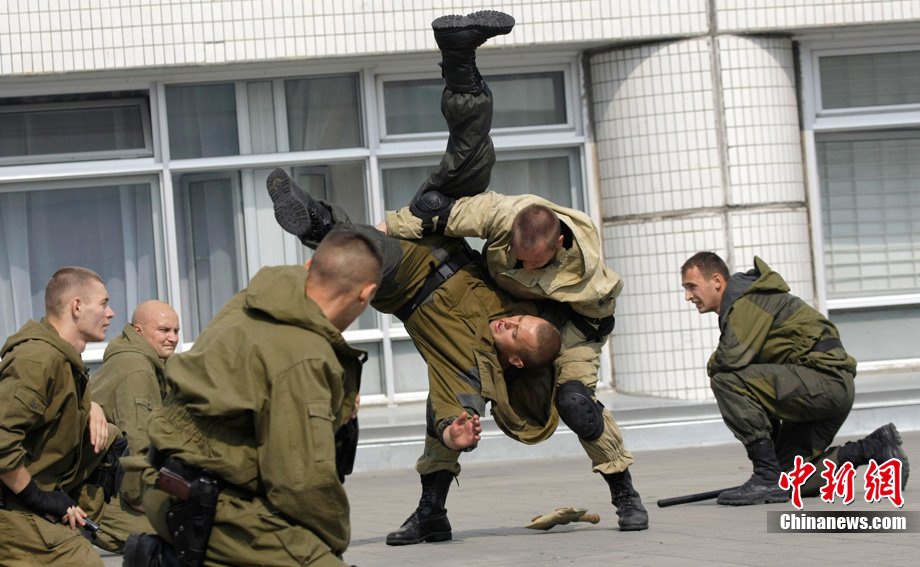 當地時間7月28日,俄羅斯特別部隊(內務部特種部隊)士兵在莫斯科郊區公開展示了其訓練成果和戰斗技能。