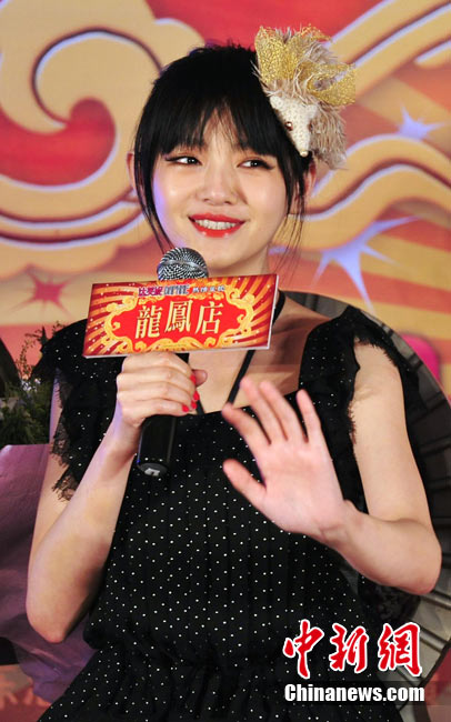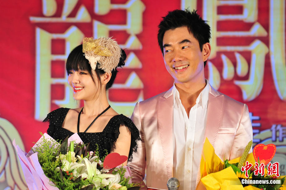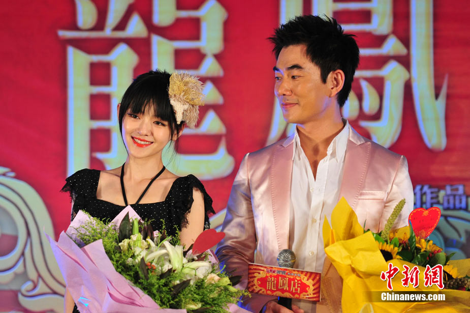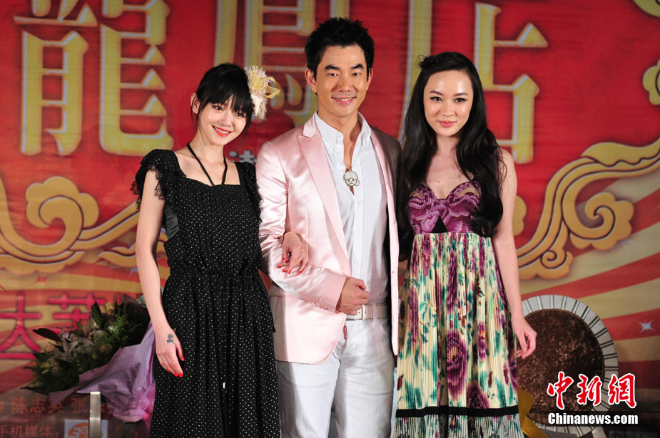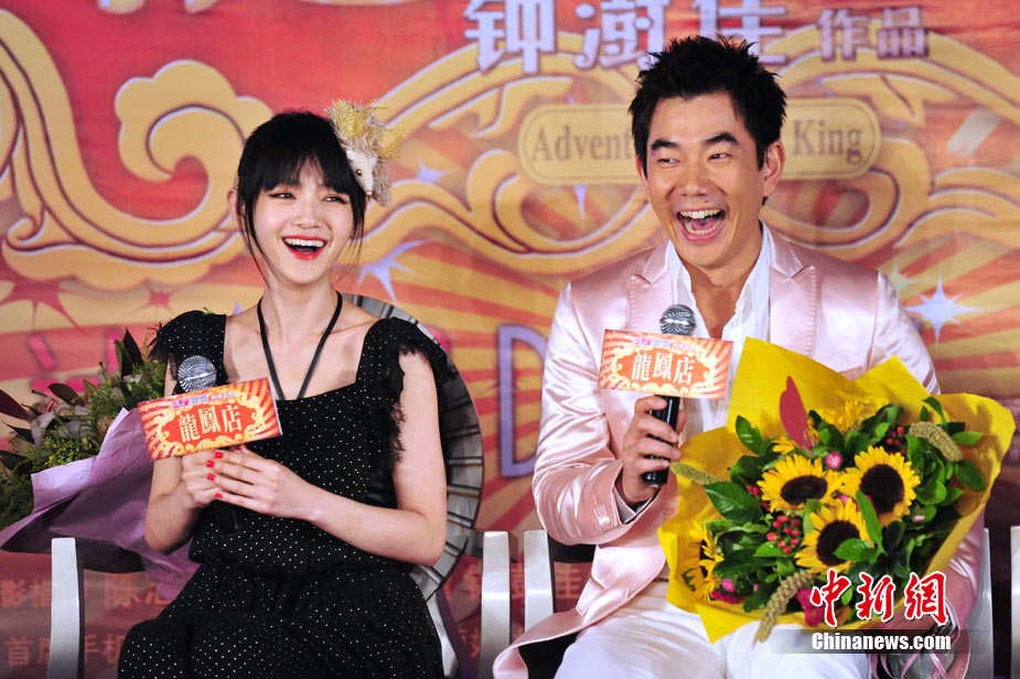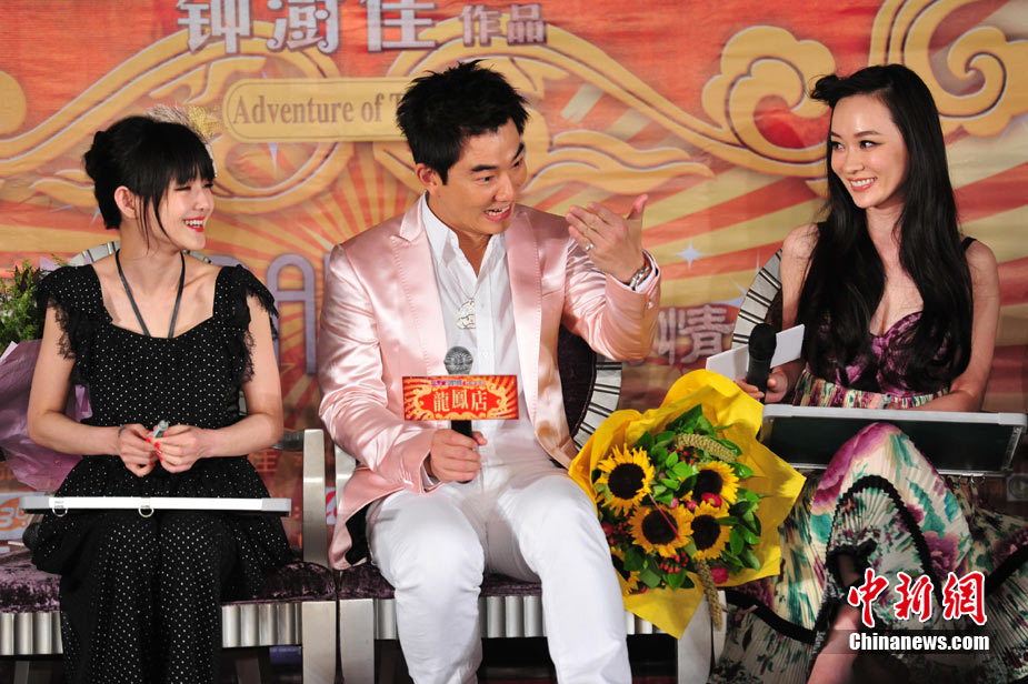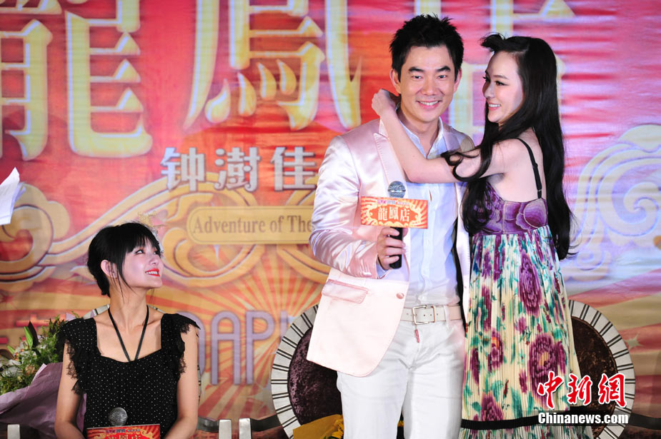 7月30日,古裝愛情喜劇《龍鳳店》在京舉辦官網啟動暨終極海報揭幕發布會,導演鐘澍佳攜主演任賢齊、大S、霍思燕亮相,臺灣著名音樂人小蟲前來助陣。大S頭戴“刺猬”發卡可愛亮相,與任賢齊在現場大談對唱《龍鳳店》主題曲的感受,大S笑稱唱歌比小S好聽。后來登臺的霍思燕卻大搶大S風頭,她為任賢齊親手戴上禮物項鏈,還親密擁抱久久對視,兩人在現場大秀親昵立刻成為眾人矚目焦點,讓大S在一旁有點沒事做。中新社記者 李學仕攝