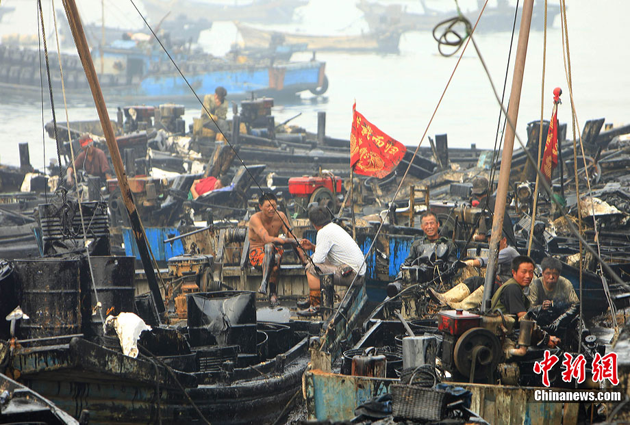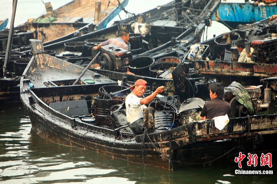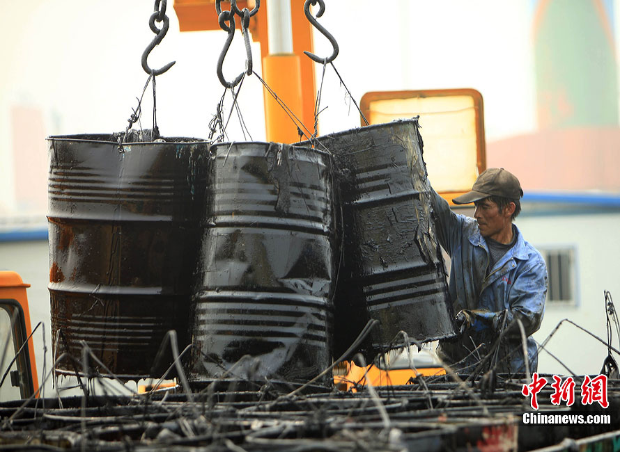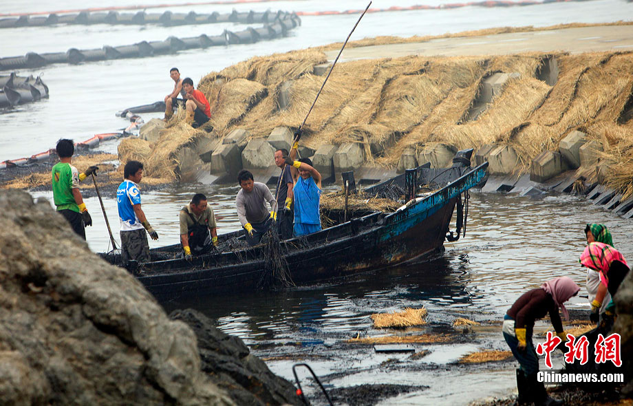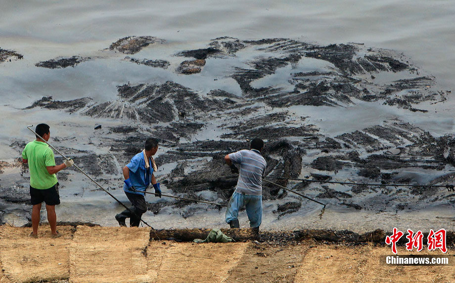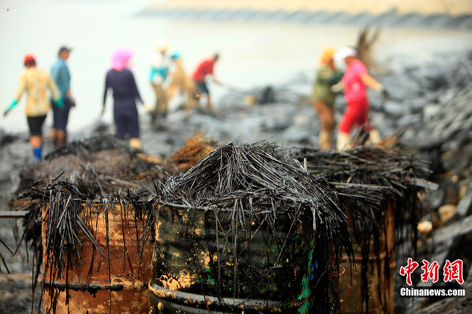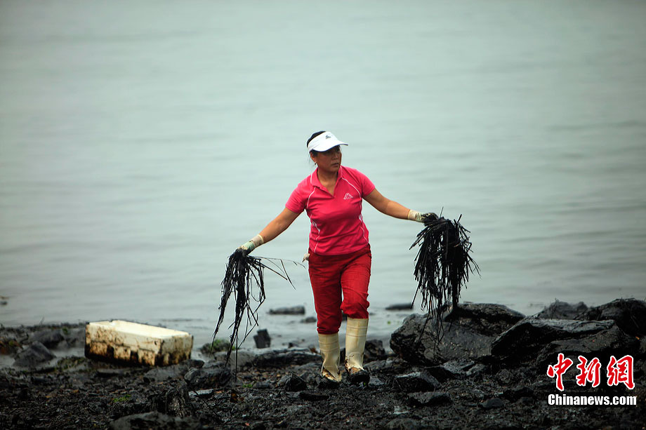 7月31日,清污人在大連大孤山附近海域沙灘上清理被海水沖到岸邊的污染物,其中很多是女性。距離大連“7·16”輸油管道爆炸火災(zāi)事故已經(jīng)半月之久了,雖然事故尚未最后認定,但事故方中石油為了善后此事,初步核算已花費至少數(shù)億。漏油事發(fā)的大連新港位于大孤山半島,三面環(huán)海,南臨大連灣,北面與大窯灣毗鄰,東朝黃海,隸屬大連保稅區(qū),距大連市區(qū)約25公里。中新社發(fā) 杜洋 攝