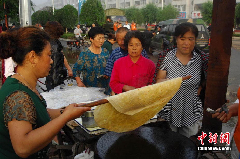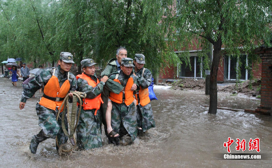 28日以來的一場暴雨讓吉林省多個地區遭遇罕見洪災,此后對災區的救援緊張進行。目前在永吉縣口前鎮,已有部分商戶恢復營業。圖為在重災區永吉縣,士兵將一名老婦轉移到安全地帶。中新社記者 張杰 攝