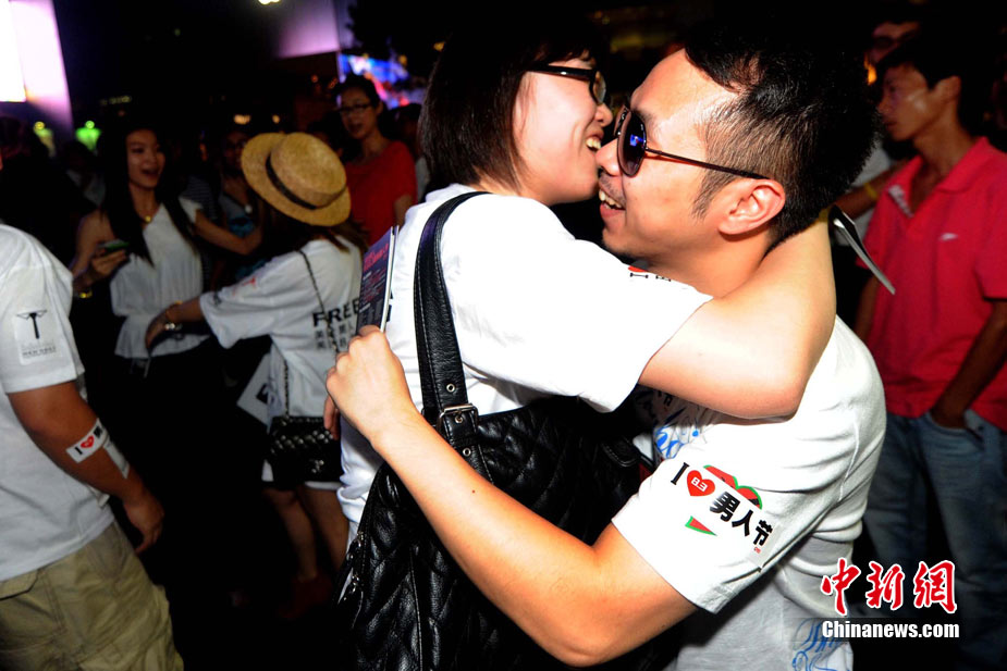 8月3日晚,在北京三里屯,俊男靚女們舉起Free Hug(免費的擁抱)的大牌子,向陌生人們發起了自由擁抱的邀請,現場千人不分男女老少相互擁抱致意。“Free Hug”活動起源于歐美,是一種倡導關心和理解的交流方式。中新社發 李學仕 攝