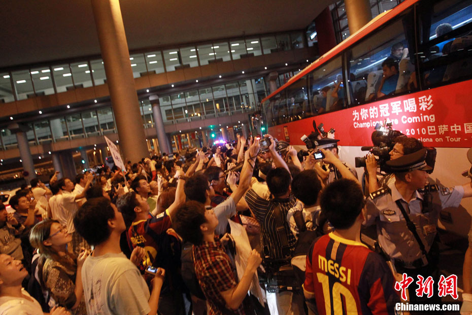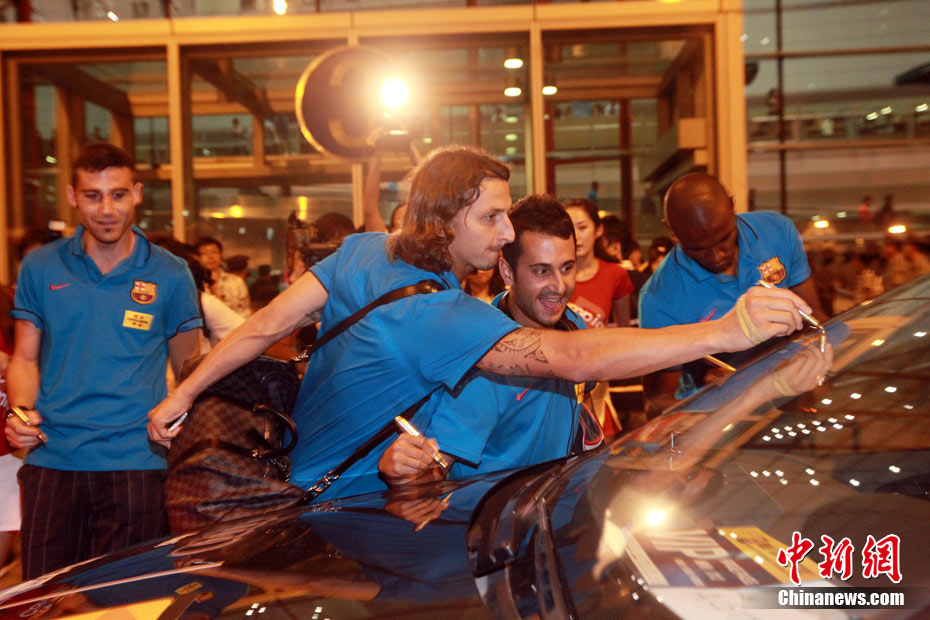 8月5日凌晨,巴薩全隊乘機從首爾飛抵北京,在首都國際機場的T3航站樓,西甲冠軍受到了數(shù)百名中國球迷的熱烈歡迎。梅西和伊布拉希莫維奇的到來,讓深夜的首都機場處于一片沸騰之中。圖為伊布拉希莫維奇在車上簽名。中新社發(fā) 杜洋 攝