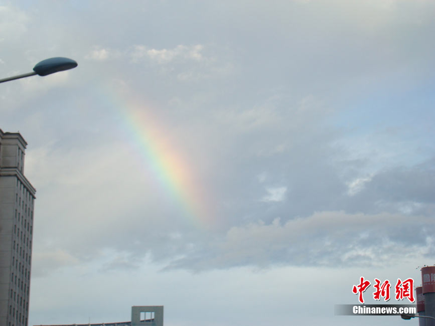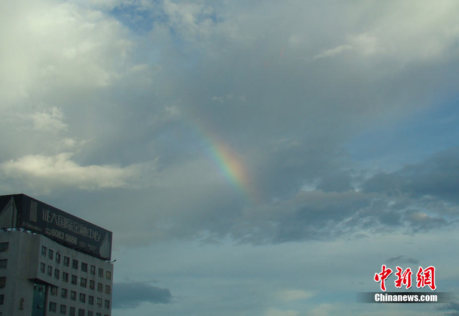 14日18時(shí)30分許,海口市府城鎮(zhèn)方向上空現(xiàn)“半截”彩虹天象,持續(xù)時(shí)間約半小時(shí)。中新社發(fā) 付美斌 攝
