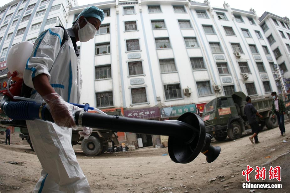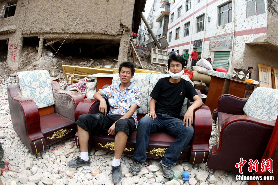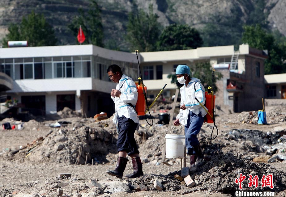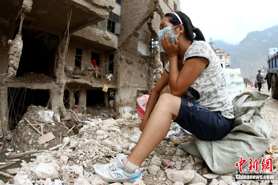 8月16日,甘肅舟曲泥石流災區,一歲大的女孩楊歡(左)、樂樂坐在臺階上,戴著大大口罩等待家人,楊歡的媽媽在這次特大泥石流災害中不幸遇難。目前,舟曲災區衛生防疫工作在不斷加強,防疫人員每天至少對安置點進行1次全面消毒、殺蟲。對于食堂、垃圾場等重點部位每天至少消毒殺菌3次以上。 中新社發 杜洋 攝