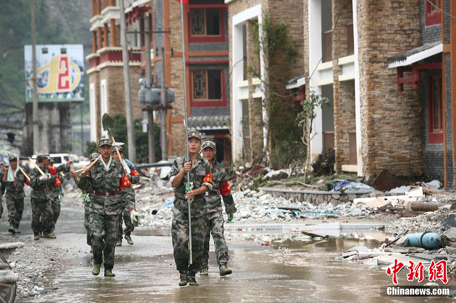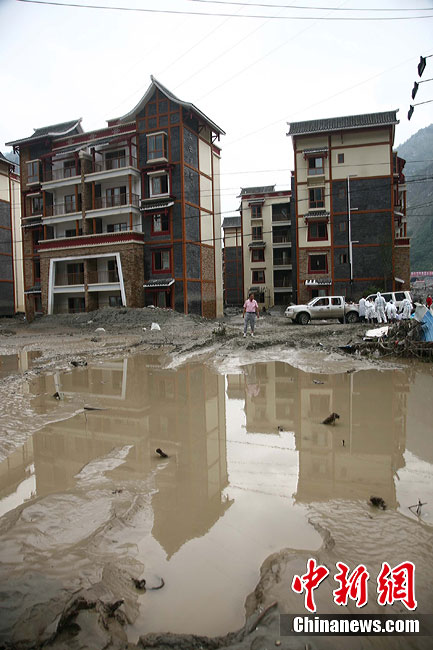 8月18日,經(jīng)過(guò)搶險(xiǎn)隊(duì)連夜奮戰(zhàn),汶川泥石流重災(zāi)區(qū)映秀鎮(zhèn)新城水位終于退去,防疫人員、清淤隊(duì)伍陸續(xù)進(jìn)入新城展開(kāi)清潔工作,武警水電三總隊(duì)于當(dāng)日對(duì)堰塞體進(jìn)行第三次爆破。圖為退水后的映秀鎮(zhèn)新城。中新社發(fā) 張浪 攝