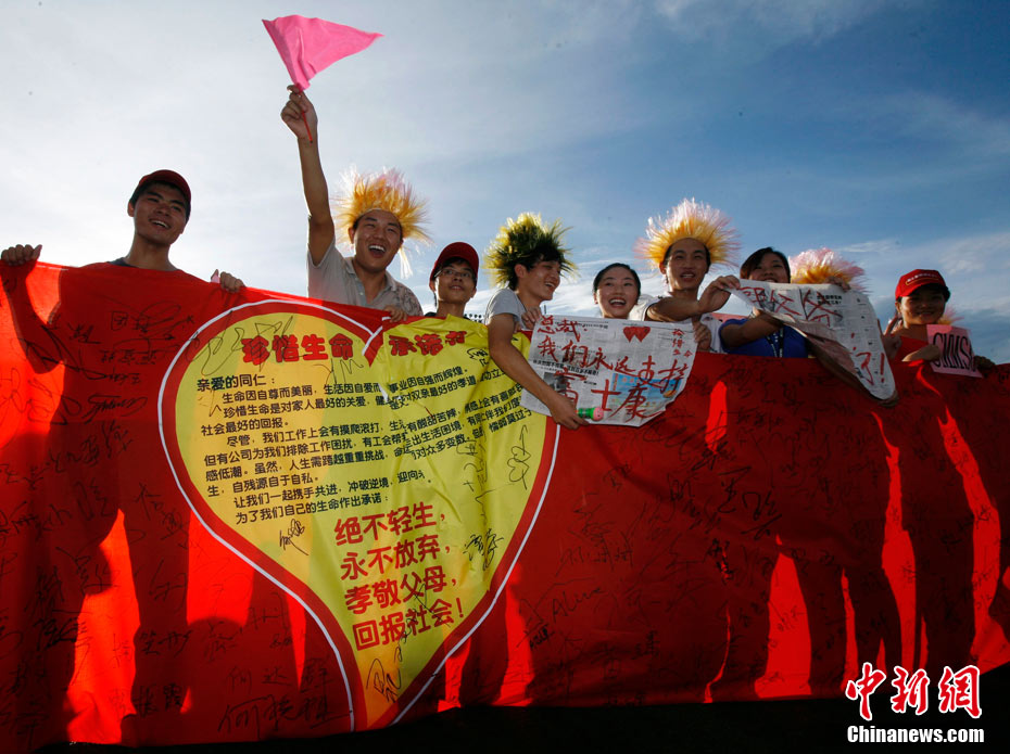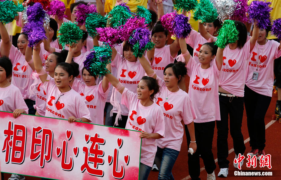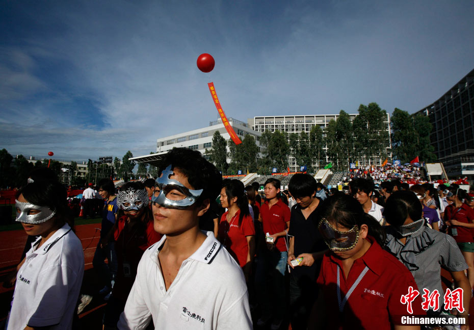 8月18日下午,深圳市富士康廠區,舉行了一場由富士康員工自發倡議、富士康工會聯合會組織的規?涨暗娜f人誓師活動,活動的主題是“珍惜生命,關愛家人”,2萬員工跟著一輛輛彩車歡聲笑語,員工們說這是他們的“狂歡節”。