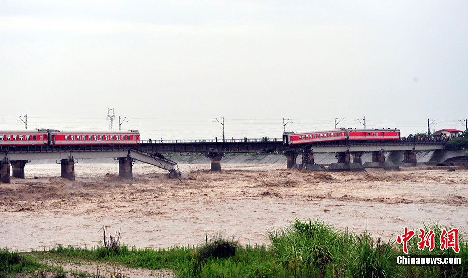 中新網成都8月19日電(楊杰 周迪迪 田甜)19日下午15時20分,從西安開往昆明的K165次列車兩節車廂在四川廣漢市境內掉進石亭江,被洪水沖出200米遠。經過緊張的營救,車上人員已全部安全轉移,未出現人員傷亡。安源 攝