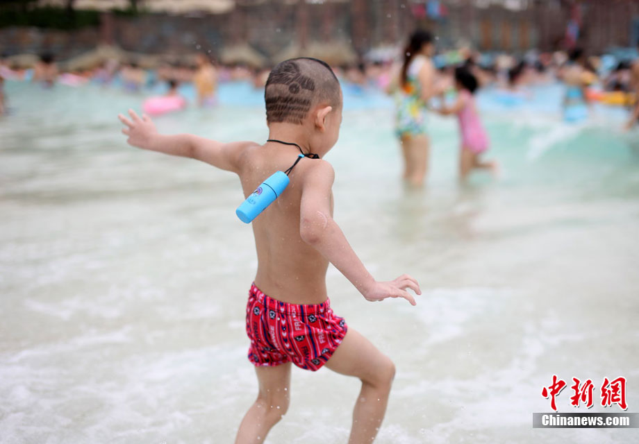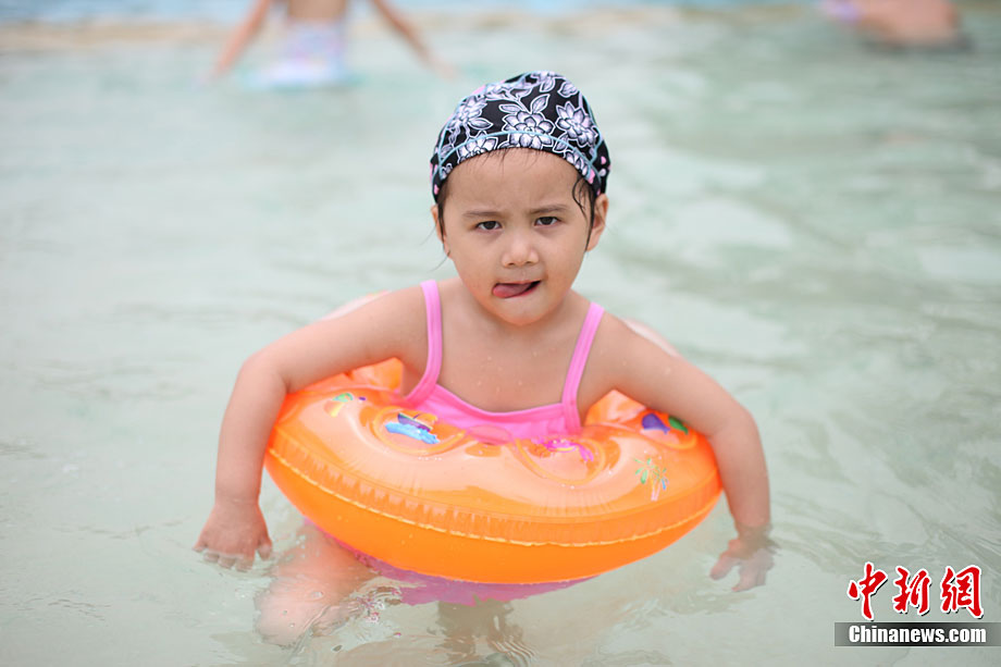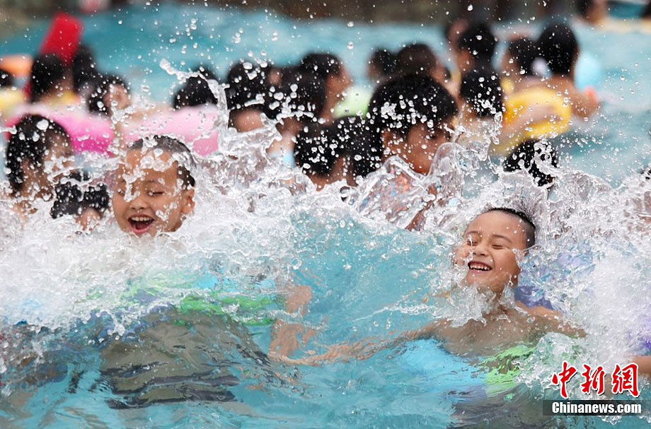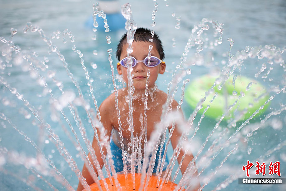 8月19日,重慶再發(fā)高溫橙色預警,預計23日以前該市將連晴高溫。為尋涼爽,一小孩趴在噴水孔附近感受水噴全身的清涼。劉函冉 攝