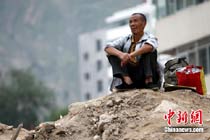 8月19日晚10時許,洪峰再次通過汶川縣映秀鎮,突如其來的洪峰沖垮了映秀鎮堰塞體旁的防護欄,造成該段岷江水位下降,湍急的水流轉向沖刷映秀鎮新城河堤,搶險隊已用裝有石料的鐵絲網圍住河堤以保護映秀鎮新城。圖為已沖毀的岷江防護欄。中新社發 張浪 攝