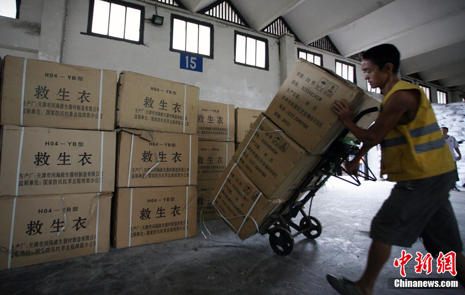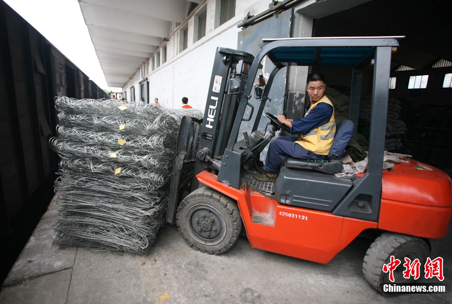 8月21日上午,國家防總緊急調撥的80艘沖鋒舟,40支橡皮舟、120臺船外機、1萬件救生衣、4000片鉛絲籠網片、4000個鋼絲網兜、500盞查險燈等搶險救災物資順利抵達成都火車東站,將立刻分發運往成都、眉山、樂山、巴中等災情嚴重地區。圖為裝卸工人正在吊裝沖鋒舟。中新社發 劉忠俊 攝