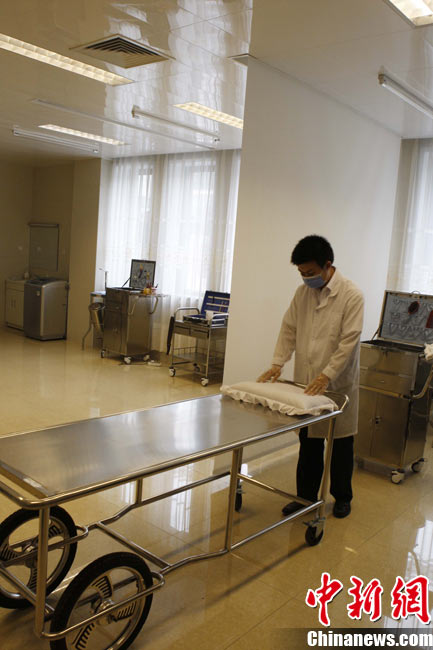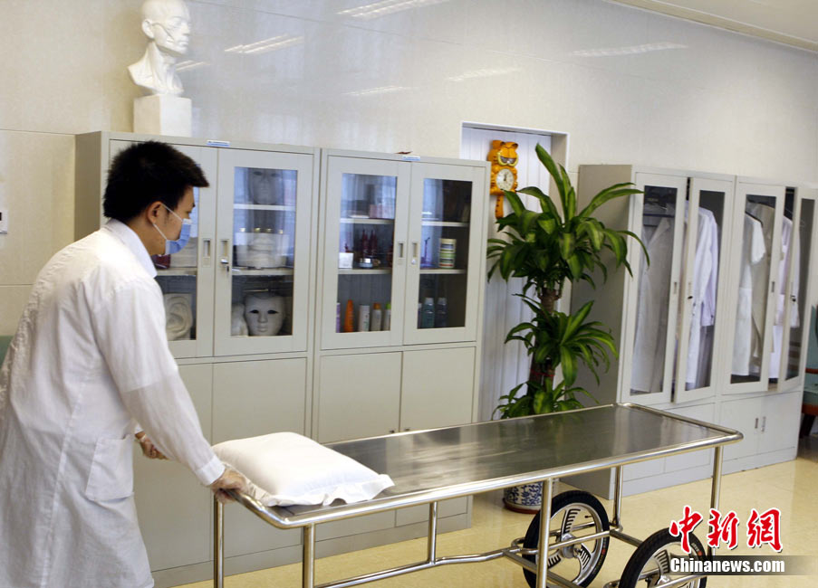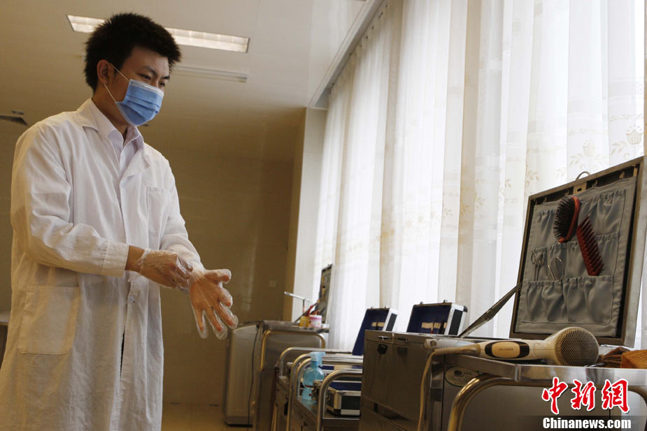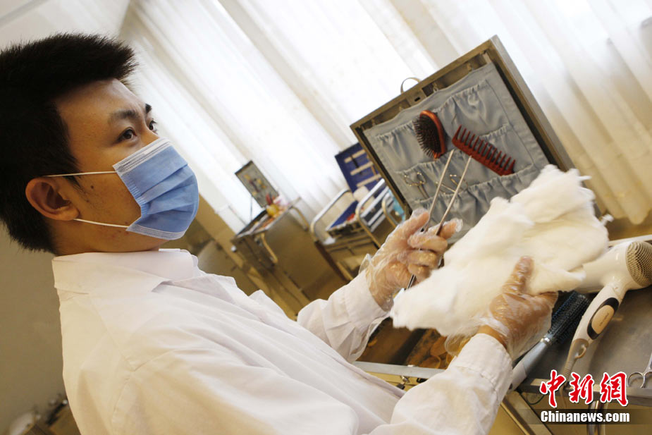 近期,北京團市委正在開展“探訪青年勞動者”活動。二十八歲的八寶山殯儀館整容師張洋便是其中之一。他自二〇〇五年進入八寶山殯儀館工作以來,勤學(xué)苦練,刻苦鉆研,勇于創(chuàng)新,共為三千余位逝者提供了高質(zhì)量的整容服務(wù),圓滿完成了二零一零年八名駐海地維和人員不幸遇難后遺體整容工作等二十余次重大任務(wù)。在剛剛結(jié)束的全國民政行業(yè)職業(yè)技能競賽中奪得大賽一等獎第一名。中新社記者 任海霞 攝