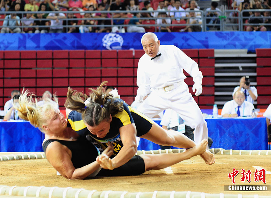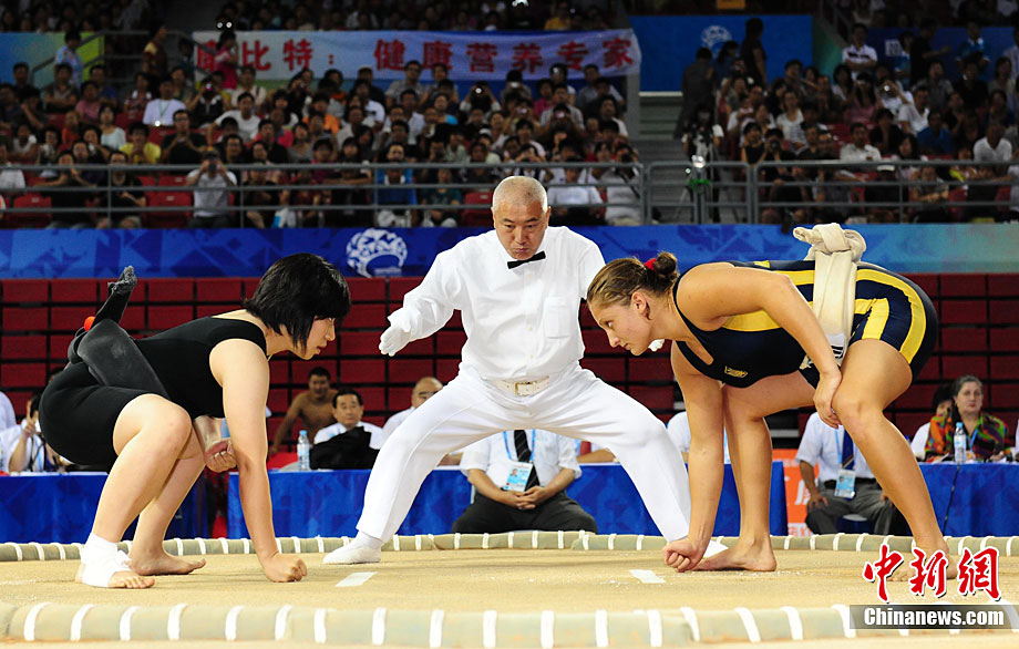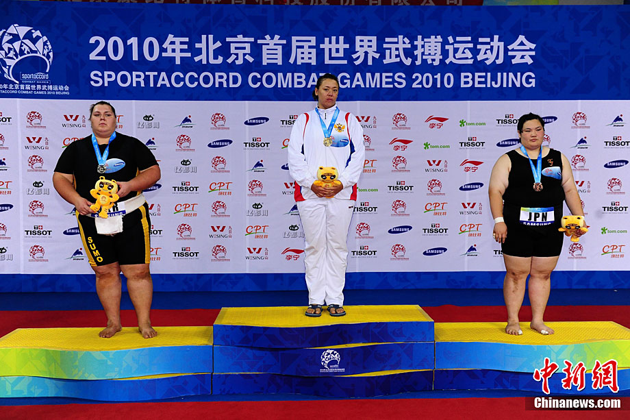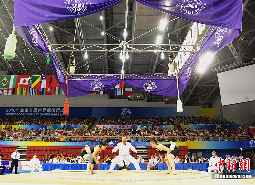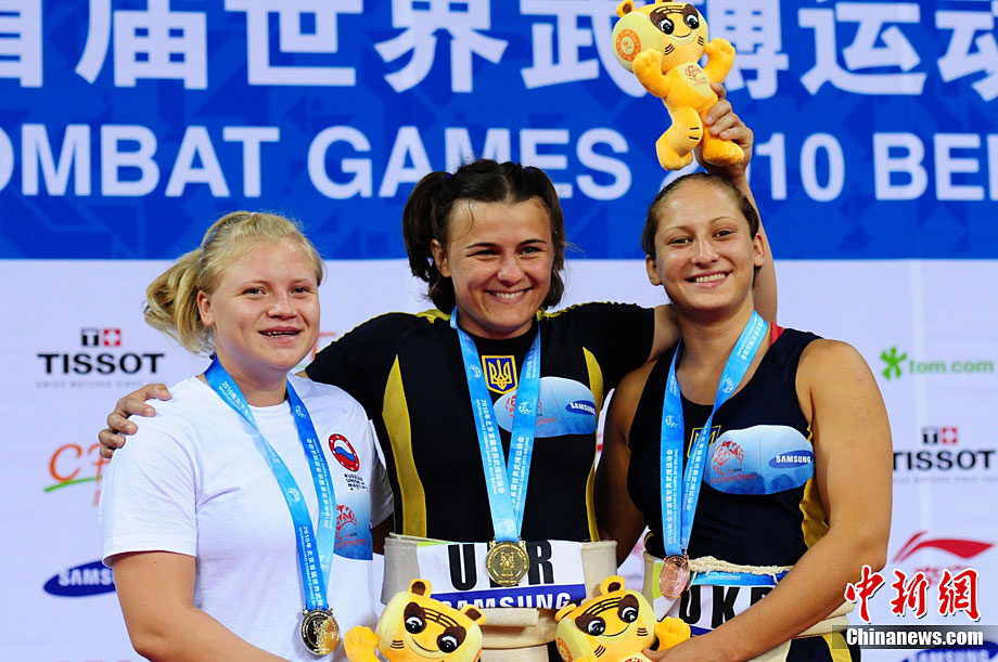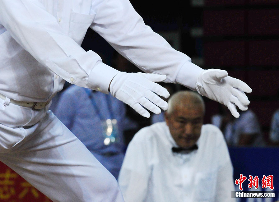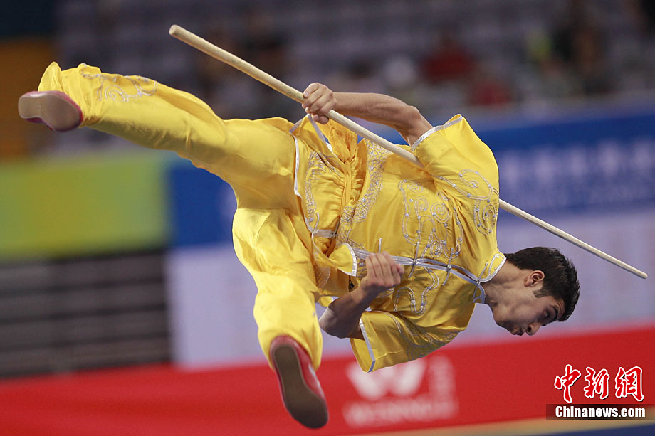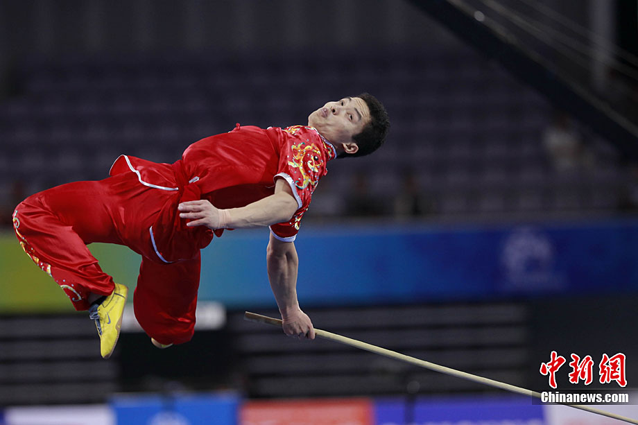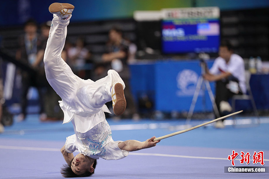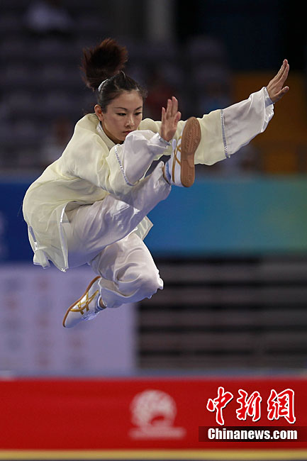 8月28日,2010年北京首屆武會進行首日比賽,其中武術項目的比賽在北京奧林匹克體育中心體育館進行。圖為中國香港選手Zheng Tian Hui在女子劍術的比賽中以9.80分穩居第一位。中新社記者 盛佳鵬 攝