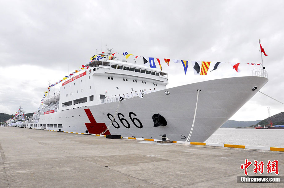 8月31日,經中央軍委批準,由中國自行研制的世界首艘萬噸級“和平方舟”號醫院船從舟山某軍港啟航,前往亞丁灣海域及吉布提、肯尼亞、坦桑尼亞、塞舌爾、孟加拉五國執行“和諧使命——2010”任務。這是中國“和平方舟”號醫院船首次赴國外執行巡診及醫療服務任務。圖片來源:cnsphoto 胡善敏 攝