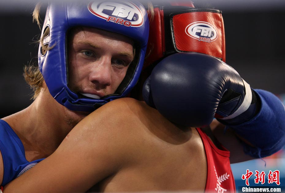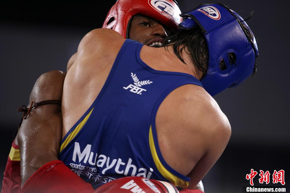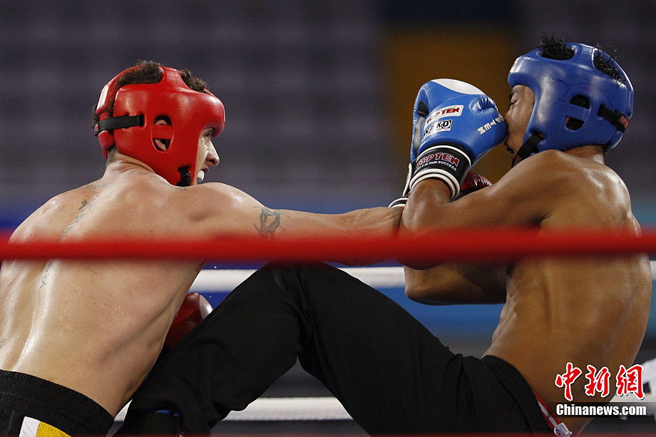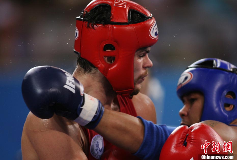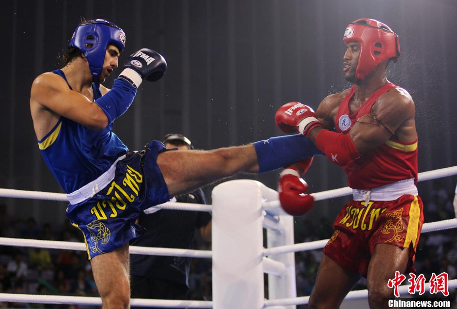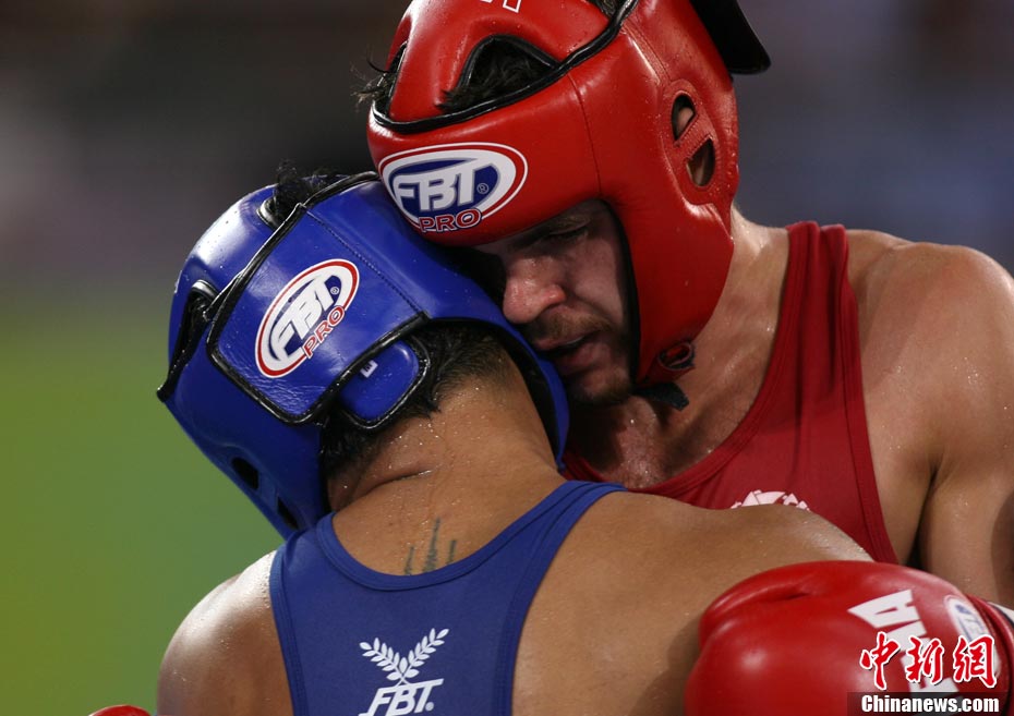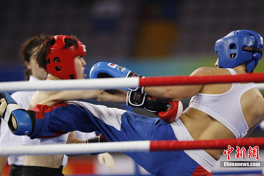 9月2日晚,2010年北京首屆世界武搏運動會進行了泰拳項目11個級別的的決賽。泰拳女子60公斤級決賽中,紅方澳大利亞選手LewisCaleySimon對陣藍方秘魯選手ShevchenkoValentina,最終澳大利亞選手不敵對手,收獲銀牌。中新社發 蘇丹 攝