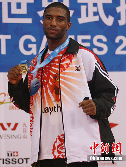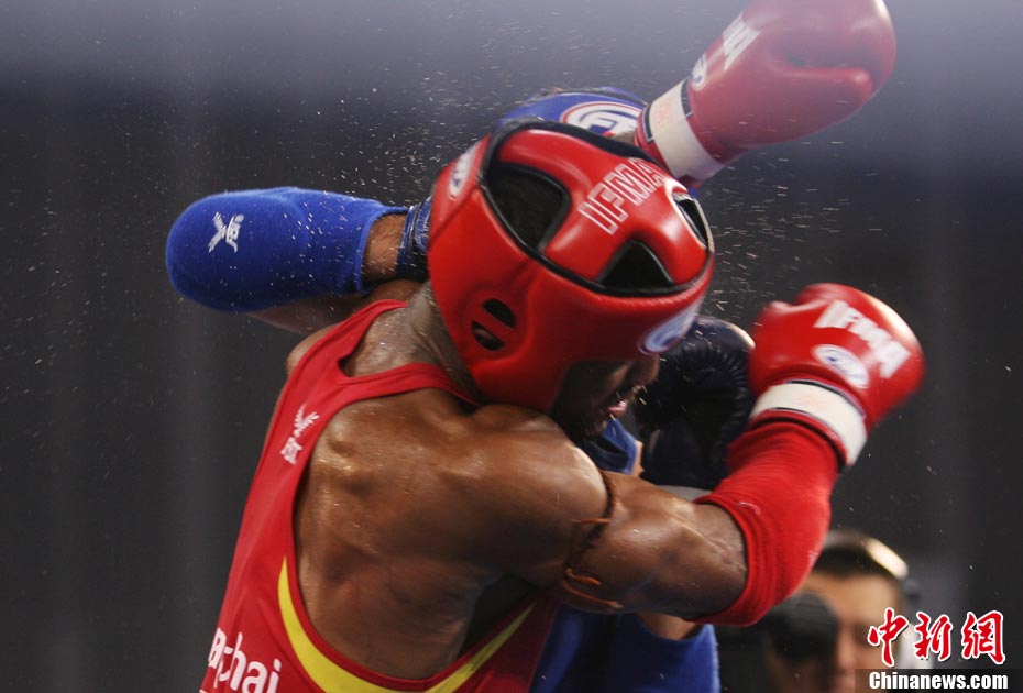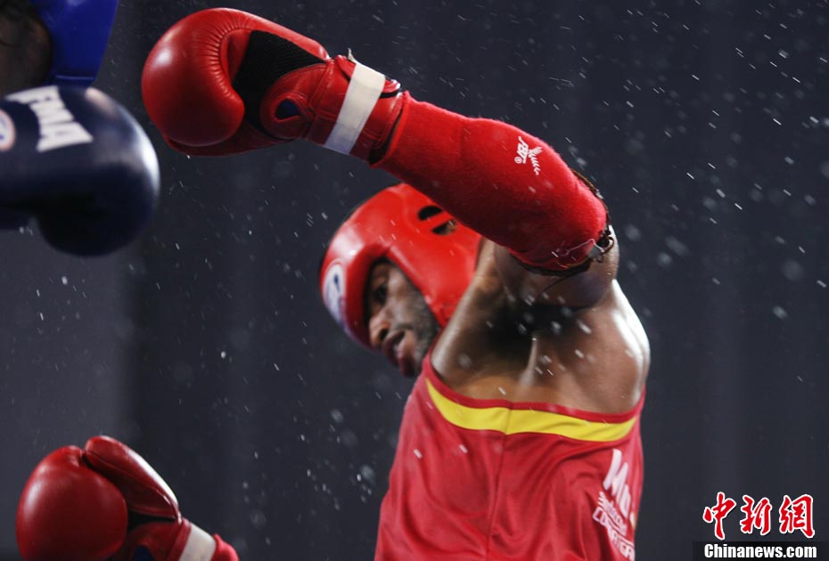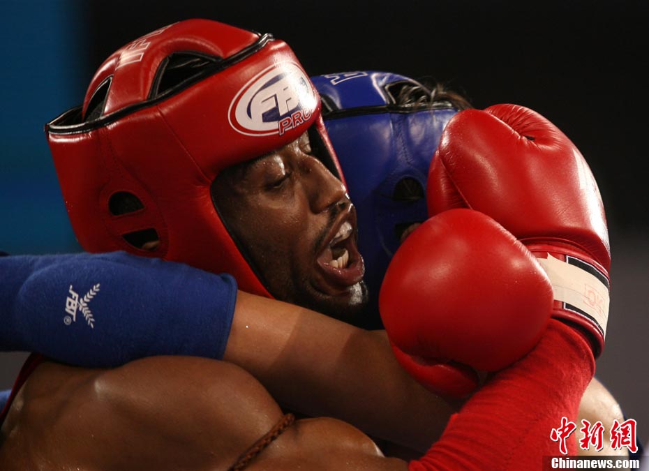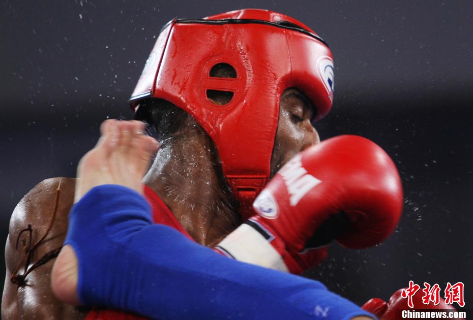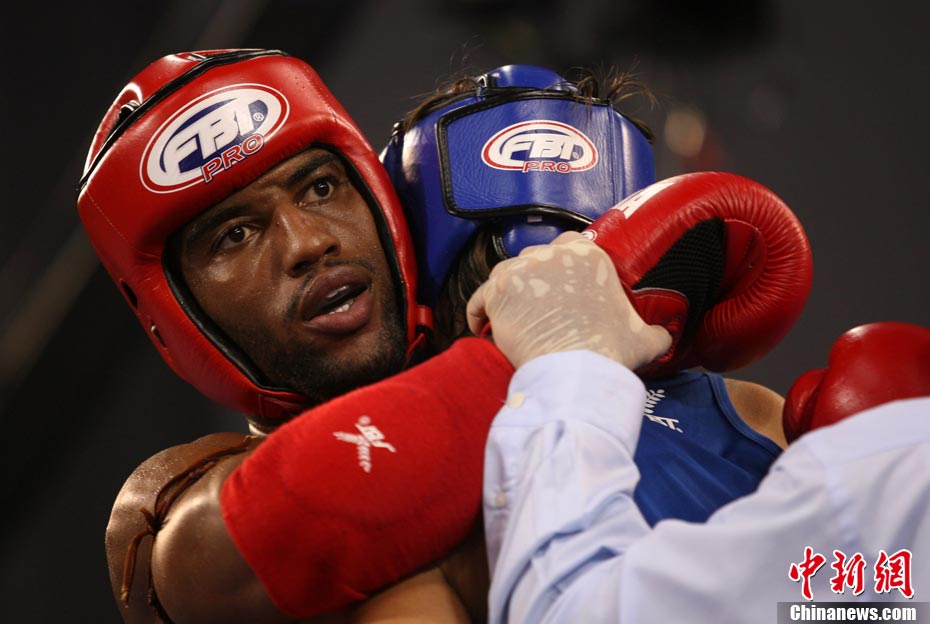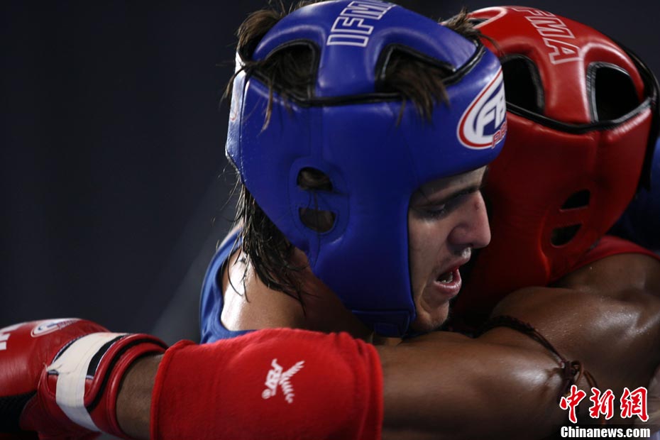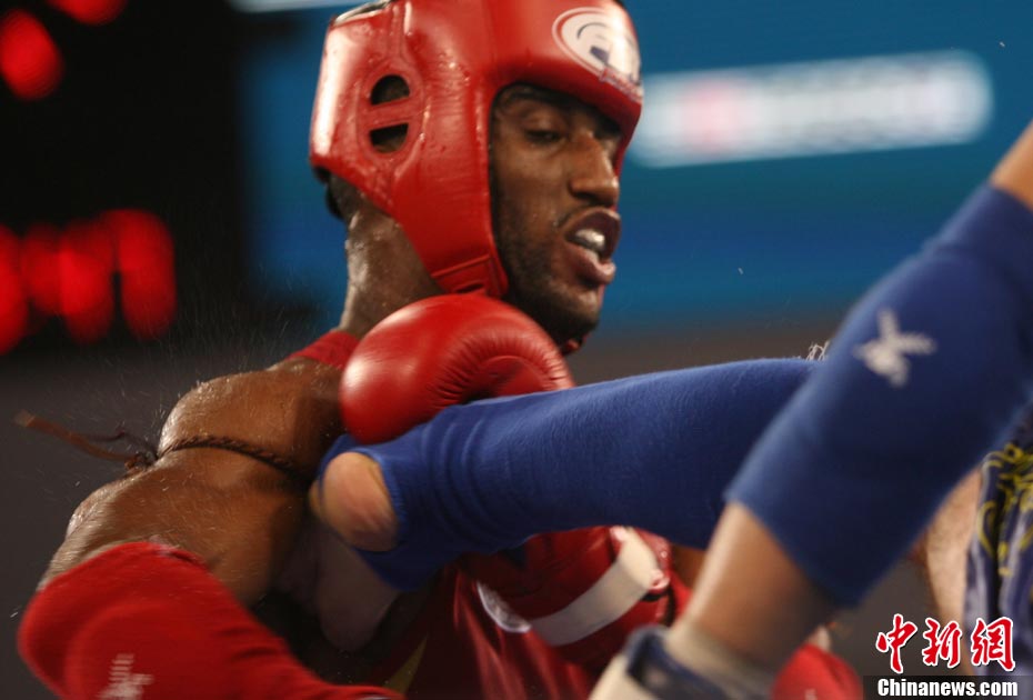 9月2日晚,2010年北京首屆世界武搏運動會進行了泰拳項目11個級別的的決賽。泰拳女子60公斤級決賽中,紅方澳大利亞選手LewisCaleySimon對陣藍方秘魯選手ShevchenkoValentina,最終澳大利亞選手不敵對手,收獲銀牌。中新社發 蘇丹 攝